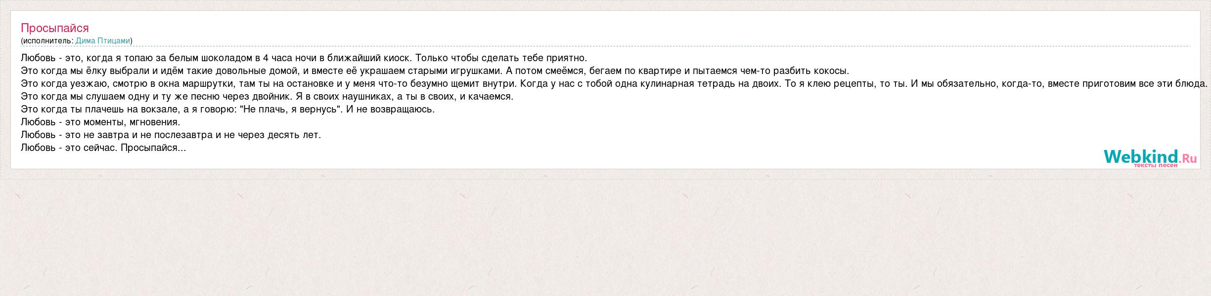 Любовь - это, когда я топаю за белым шоколадом в 4 часа ночи в ближайший киоск. Только чтобы сделать тебе приятно. Это когда мы ёлку выбрали и идём такие довольные домой, и вместе её украшаем старыми игрушками. А потом смеёмся, бегаем по квартире и пытаемся чем-то разбить кокосы. Это когда уезжаю, смотрю в окна маршрутки, там ты на остановке и у меня что-то безумно щемит внутри. Когда у нас с тобой одна кулинарная тетрадь на двоих. То я клею рецепты, то ты. И мы обязательно, когда-то, вместе приготовим все эти блюда. Это когда мы слушаем одну и ту же песню через двойник. Я в своих наушниках, а ты в своих, и качаемся. Это когда ты плачешь на вокзале, а я говорю: "Не плачь, я вернусь". И не возвращаюсь. Любовь - это моменты, мгновения. Любовь - это не завтра и не послезавтра и не через десять лет. Любовь - это сейчас. Просыпайся...