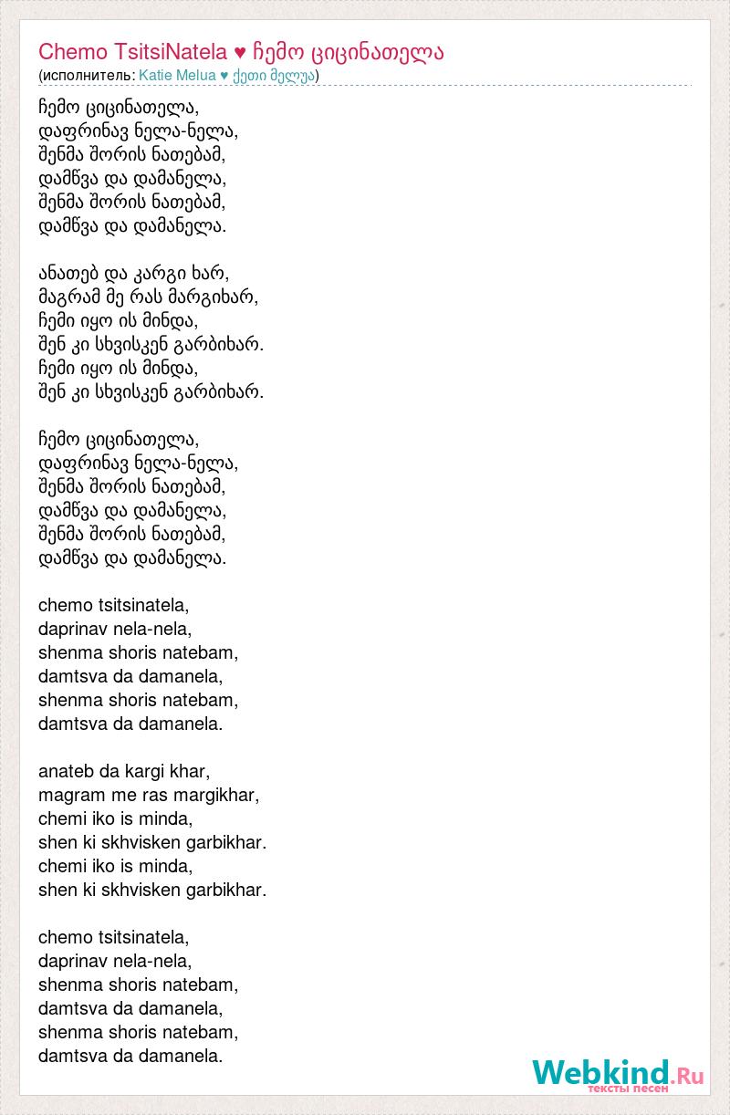 ჩემო ციცინათელა, დაფრინავ ნელა-ნელა, შენმა შორის ნათებამ, დამწვა და დამანელა, შენმა შორის ნათებამ, დამწვა და დამანელა. ანათებ და კარგი ხარ, მაგრამ მე რას მარგიხარ, ჩემი იყო ის მინდა, შენ კი სხვისკენ გარბიხარ. ჩემი იყო ის მინდა, შენ კი სხვისკენ გარბიხარ. ჩემო ციცინათელა, დაფრინავ ნელა-ნელა, შენმა შორის ნათებამ, დამწვა და დამანელა, შენმა შორის ნათებამ, დამწვა და დამანელა. chemo tsitsinatela, daprinav nela-nela, shenma shoris natebam, damtsva da damanela, shenma shoris natebam, damtsva da damanela. anateb da kargi khar, magram me ras margikhar, chemi iko is minda, shen ki skhvisken garbikhar. chemi iko is minda, shen ki skhvisken garbikhar. chemo tsitsinatela, daprinav nela-nela, shenma shoris natebam, damtsva da damanela, shenma shoris natebam, damtsva da damanela.