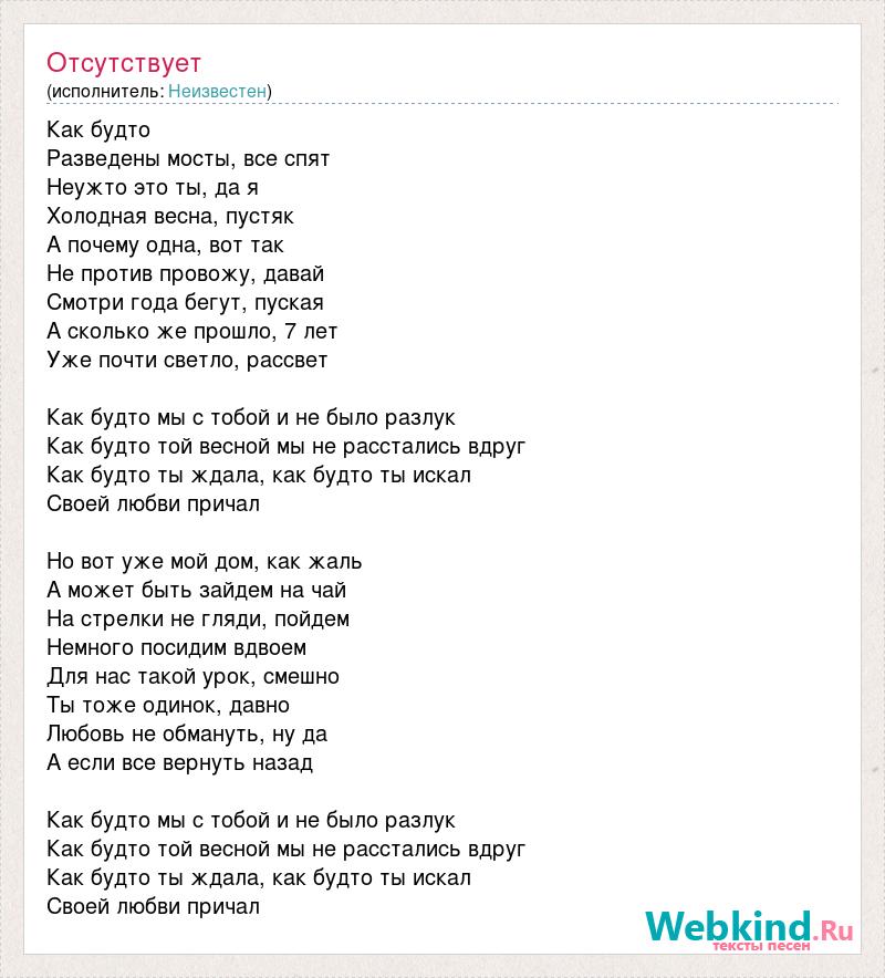 Как будто Разведены мосты, все спят Неужто это ты, да я Холодная весна, пустяк А почему одна, вот так Не против провожу, давай Смотри года бегут, пуская А сколько же прошло, 7 лет Уже почти светло, рассвет Как будто мы с тобой и не было разлук Как будто той весной мы не расстались вдруг Как будто ты ждала, как будто ты искал Своей любви причал Но вот уже мой дом, как жаль А может быть зайдем на чай На стрелки не гляди, пойдем Немного посидим вдвоем Для нас такой урок, смешно Ты тоже одинок, давно Любовь не обмануть, ну да А если все вернуть назад Как будто мы с тобой и не было разлук Как будто той весной мы не расстались вдруг Как будто ты ждала, как будто ты искал Своей любви причал