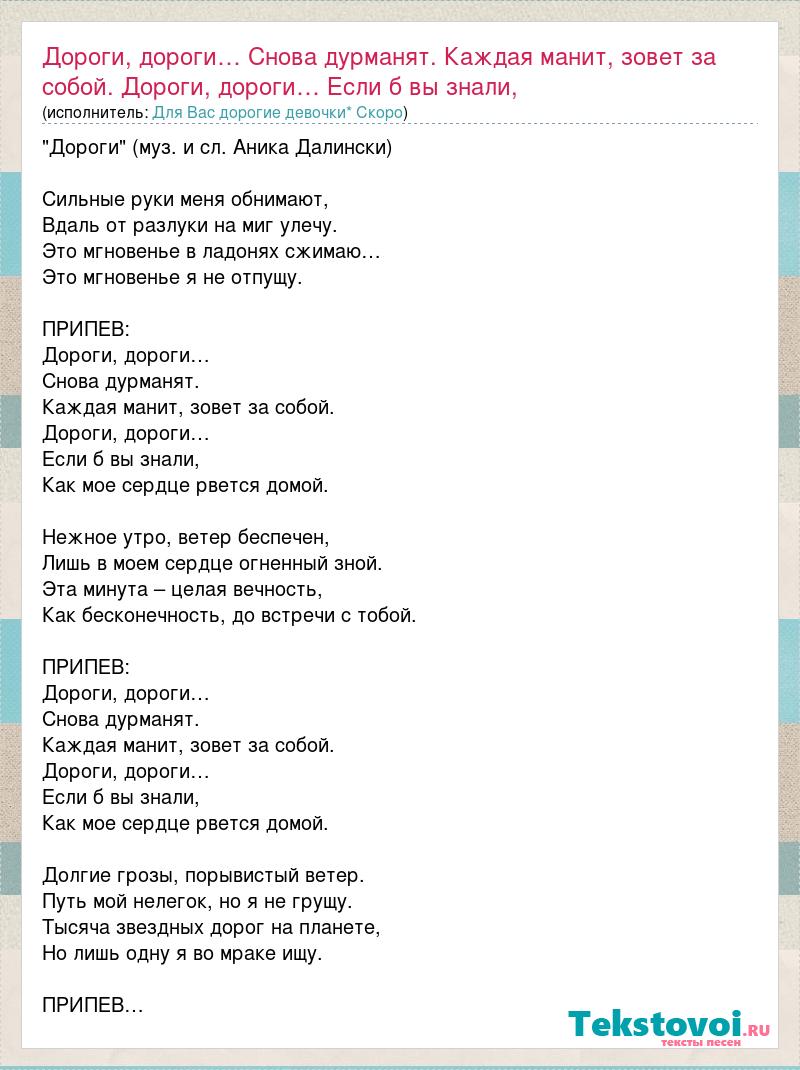 Главная→Исполнители→Для Вас дорогие девочки* Скоро→Дороги, дороги… Снова дурманят. Каждая манит, зовет за собой. Дороги, д