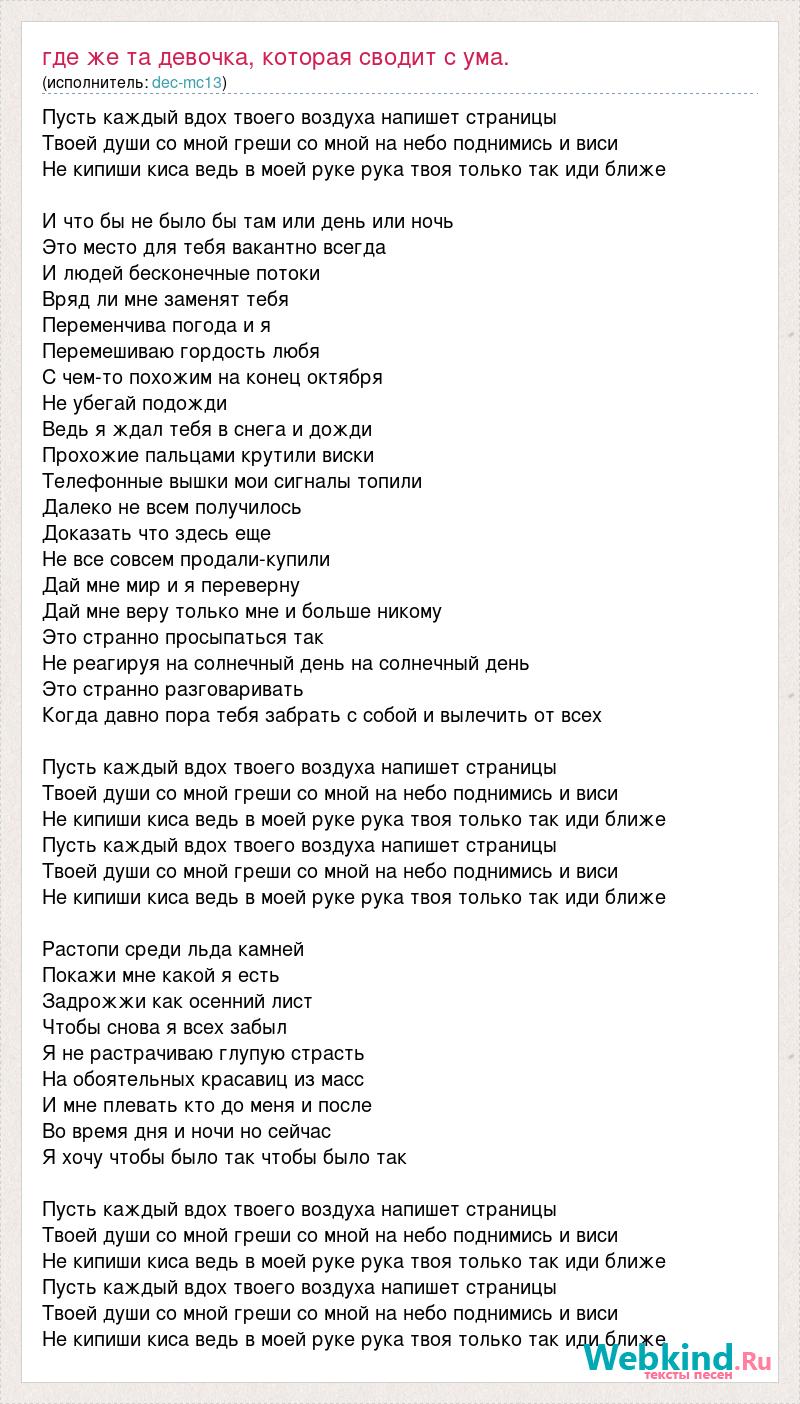 Пусть каждый вдох твоего воздуха напишет страницы Твоей души со мной греши со мной на небо поднимись и виси Не кипиши киса ведь в моей руке рука твоя только так иди ближе И что бы не было бы там или день или ночь Это место для тебя вакантно всегда И людей бесконечные потоки Вряд ли мне заменят тебя Переменчива погода и я Перемешиваю гордость любя С чем-то похожим на конец октября Не убегай подожди Ведь я ждал тебя в снега и дожди Прохожие пальцами крутили виски Телефонные вышки мои сигналы топили Далеко не всем получилось Доказать что здесь еще Не все совсем продали-купили Дай мне мир и я переверну Дай мне веру только мне и больше никому Это странно просыпаться так Не реагируя на солнечный день на солнечный день Это странно разговаривать Когда давно пора тебя забрать с собой и вылечить от всех Пусть каждый вдох твоего воздуха напишет страницы Твоей души со мной греши со мной на небо поднимись и виси Не кипиши киса ведь в моей руке рука твоя только так иди ближе Пусть каждый вдох твоего воздуха напишет страницы Твоей души со мной греши со мной на небо поднимись и виси Не кипиши киса ведь в моей руке рука твоя только так иди ближе Растопи среди льда камней Покажи мне какой я есть Задрожжи как осенний лист Чтобы снова я всех забыл Я не растрачиваю глупую страсть На обоятельных красавиц из масс И мне плевать кто до меня и после Во время дня и ночи но сейчас Я хочу чтобы было так чтобы было так Пусть каждый вдох твоего воздуха напишет страницы Твоей души со мной греши со мной на небо поднимись и виси Не кипиши киса ведь в моей руке рука твоя только так иди ближе Пусть каждый вдох твоего воздуха напишет страницы Твоей души со мной греши со мной на небо поднимись и виси Не кипиши киса ведь в моей руке рука твоя только так иди ближе