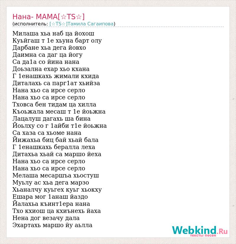 Милаша хьа наб ца йохош Куьйгаш т 1е хьуна барт олу Дарбане хьа дега йовхо Даимна са даг ца йогу Са да1а со йина нана Доьзална ехар хьо кхана Г 1енашкахь жимали кхида Диталахь са парг1ат хьийза Нана хьо са ирсе серло Нана хьо са ирсе серло Тховса бен тидам ца хилла Къоьжала месаш т 1е йоьжна Лацалуш дагахь ша бина Йоьлху со г 1айби т1е йоьжна Са хаза са хьоме нана Йижахьа биц бай хьай бала Г 1енашкахь бералла леха Дитахьа хьай са маршо йеха Нана хьо са ирсе серло Нана хьо са ирсе серло Мелаша месаршъа хьостуш Муьлу ас хьа дега марзо Хьаналчу куьгех куьг хьокху Ешара мог 1анаш йаздо Йалахьа къинт1ера нана Тхо кхиош ца кхиънехь йаха Нена дог везачу дала Эхартахь маршо йу аьлла