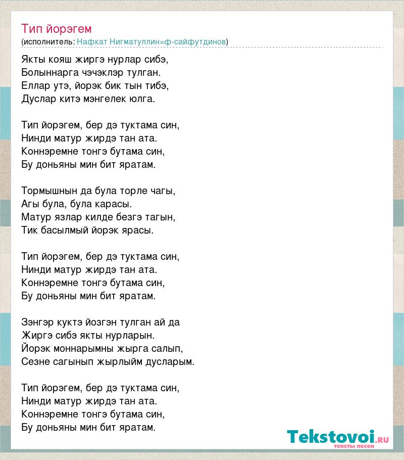 Якты кояш жиргэ нурлар сибэ, Болыннарга чэчэклэр тулган. Еллар утэ, йорэк бик тын тибэ, Дуслар китэ мэнгелек юлга. Тип йорэгем, бер дэ туктама син, Нинди матур жирдэ тан ата. Коннэремне тонгэ бутама син, Бу доньяны мин бит яратам. Тормышнын да була торле чагы, Агы була, була карасы. Матур язлар килде безгэ тагын, Тик басылмый йорэк ярасы. Тип йорэгем, бер дэ туктама син, Нинди матур жирдэ тан ата. Коннэремне тонгэ бутама син, Бу доньяны мин бит яратам. Зэнгэр куктэ йозгэн тулган ай да Жиргэ сибэ якты нурларын. Йорэк моннарымны жырга салып, Сезне сагынып жырлыйм дусларым. Тип йорэгем, бер дэ туктама син, Нинди матур жирдэ тан ата. Коннэремне тонгэ бутама син, Бу доньяны мин бит яратам.