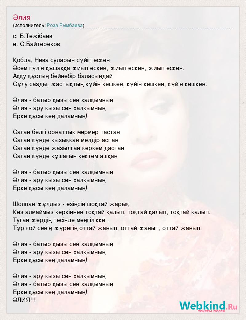 с. Б.Тәжібаев ә. С.Байтереков Қобда, Нева суларын сүйіп өскен Әсем гүлін құшаққа жиып өскен, жиып өскен, жиып өскен. Аққу құстың бейнебір баласындай Сұлу сазды, жастықтың күйін кешкен, күйін кешкен, күйін кешкен. Әлия - батыр қызы сен халқымның Әлия - ару қызы сен халқымның Ерке құсы кең даламның! Саған белгі орнаттық мәрмәр тастан Саған күнде қызыққан мөлдір аспан Саған күнде жазылған көркем дастан Саған күнде құшағын көктем ашқан Әлия - батыр қызы сен халқымның Әлия - ару қызы сен халқымның Ерке құсы кең даламның! Шолпан жұлдыз - өзіңсің шоқтай жарық Көз алмаймыз көркіңнен тоқтай қалып, тоқтай қалып, тоқтай қалып. Туған жердің төсінде мәңгілікке Тұр ғой сенің жүрегің оттай жанып, оттай жанып, оттай жанып. Әлия - батыр қызы сен халқымның Әлия - ару қызы сен халқымның Ерке құсы кең даламның! Әлия - ару қызы сен халқымның Әлия - батыр қызы сен халқымның Ерке құсы кең даламның! ӘЛИЯ!!!