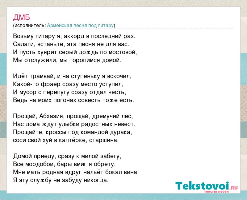 Возьму гитару я, аккорд в последний раз. Салаги, встаньте, эта песня не для вас. И пусть хуярит серый дождь по мостовой, Мы отслужили, мы торопимся домой. Идёт трамвай, и на ступеньку я вскочил, Какой-то фраер сразу место уступил, И мусор с перепугу сразу отдал честь, Ведь на моих погонах совесть тоже есть. Прощай, Абхазия, прощай, дремучий лес, Нас дома ждут улыбки радостных невест. Прощайте, кроссы под командой дурака, соси свой хуй в каптёрке, старшина. Домой приеду, сразу к милой забегу, Все мордобои, бары вмиг я обрету. Мне мать родная вдруг нальёт бокал вина Я эту службу не забуду никогда.