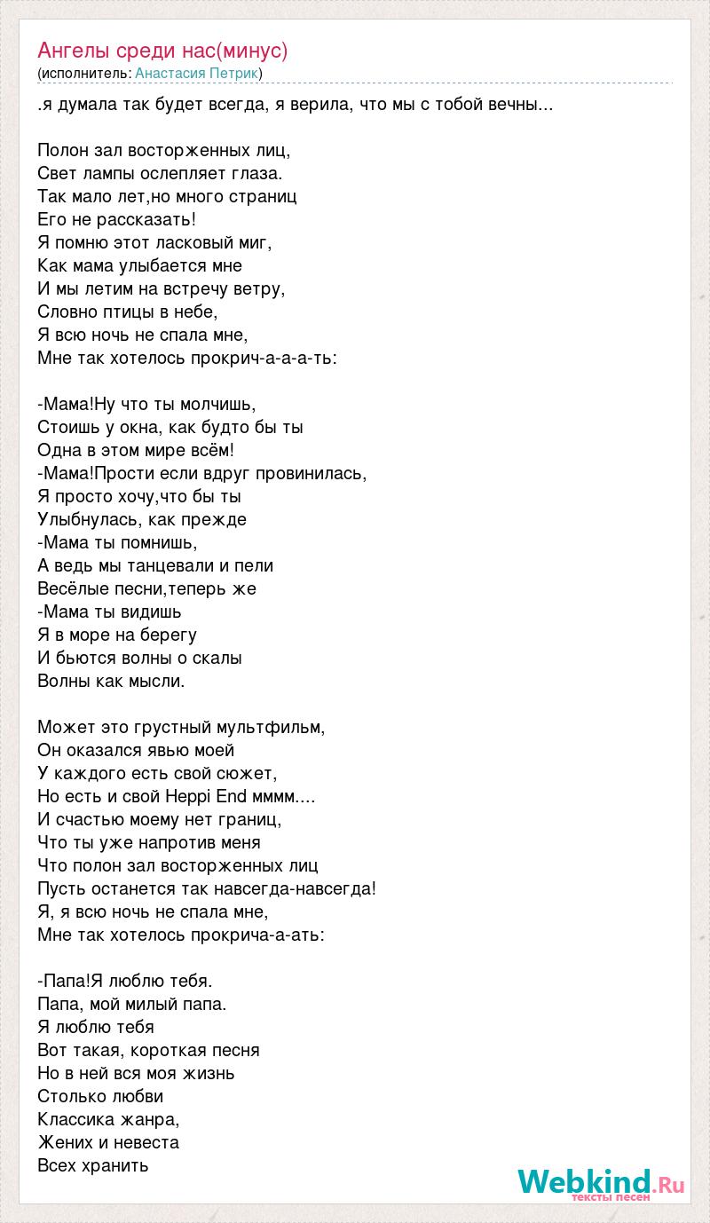 .я думала так будет всегда, я верила, что мы с тобой вечны... Полон зал восторженных лиц, Свет лампы ослепляет глаза. Так мало лет,но много страниц Его не рассказать! Я помню этот ласковый миг, Как мама улыбается мне И мы летим на встречу ветру, Словно птицы в небе, Я всю ночь не спала мне, Мне так хотелось прокрич-а-а-а-ть: -Мама!Ну что ты молчишь, Стоишь у окна, как будто бы ты Одна в этом мире всём! -Мама!Прости если вдруг провинилась, Я просто хочу,что бы ты Улыбнулась, как прежде -Мама ты помнишь, А ведь мы танцевали и пели Весёлые песни,теперь же -Мама ты видишь Я в море на берегу И бьются волны о скалы Волны как мысли. Может это грустный мультфильм, Он оказался явью моей У каждого есть свой сюжет, Но есть и свой Heppi End мммм.... И счастью моему нет границ, Что ты уже напротив меня Что полон зал восторженных лиц Пусть останется так навсегда-навсегда! Я, я всю ночь не спала мне, Мне так хотелось прокрича-а-ать: -Папа!Я люблю тебя. Папа, мой милый папа. Я люблю тебя Вот такая, короткая песня Но в ней вся моя жизнь Столько любви Классика жанра, Жених и невеста Всех хранить