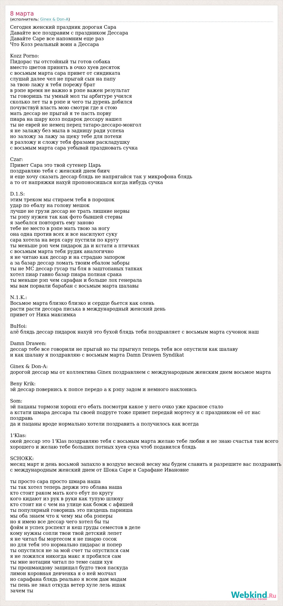 Сегодня женский праздник дорогая Сара Давайте все поздравим с праздником Дессара Давайте Саре все напомним еще раз Что Козз реальный воин а Дессара Kozz Porno: Пидорас ты отстойный ты готов собака вместо цветов принять в очко хуев десяток с восьмым марта сара привет от синдиката слушай далее чел не прыгай сын на папу за твою лажу я тебя порежу брат в рэпе время не важно в рэпе важен результат ты говоришь ты умный мол ты арбитуре учился сколько лет ты в рэпе и чего ты дурень добился почувствуй власть мою смотри где я стою мать дессар не прыгай я те пасть порву пиара на шару козз подарок дессару нашел ты не еврей не немец перец татаро-дессаро-монгол я не залажу без мыла в задницу ради успеха но заложу за лажу за щеку тебе для потехи я разложу и сложу тебя фразами раскладушку с восьмым марта сара уебывай праздновать сучка Czar: Привет Сара это твой сутенер Царь поздравляю тебя с женский днем биич и еще хочу сказать дессар блядь не напрягайся так у микрофона блядь а то от напряжки нахуй пропоносишься когда нибудь сучка D.1.S: этим треком мы стираем тебя в порошок удар по ебалу на голову мешок лучше не грузи дессар не трать лишние нервы ты рэпу нужен так как фото бывшей стервы я заебался повторять ему заново тебе не место в рэпе мать твою за ногу она одна против всех и все насилуют суку сара хотела на верх сару пустили по кругу ты меньше рэп чем пидарок да и кстати а птичках с восьмым марта тебя рудик аналогично я не читаю как дессар и на страдаю запором а за базар дессар ломать твоим ебалом заборы ты не МС дессар гусар ты бля в заштопаных тапках хотел пиар гавно базар пиара полная срака ты меньше рэп чем сарафан и больше лох генерала мы вам порвали барабан с восьмым марта шалавы N.1.K.: Восьмое марта близко близко и сердце бьется как олень расти расти дессара писька в международный женский день привет от Ника максимка BuHoi: алё блядь дессар пидарок нахуй это бухой блядь тебя поздравляет с восьмым марта сучонок наш Damn Drawen: дессар тебе все говорили не прыгай но ты прыгнул теперь тебя все опустили как шалаву и как шалаву я поздравляю с восьмым марта Damn Drawen Syndikat Ginex & Don-A: дорогой дессар мы от коллектива Ginex поздравляем с международным женским днем восьмое марта Beny Krik: эй дессар повернись к попсе передо а к рэпу задом и немного наклонись Som: эй пацаны тормози хорош его ебать посмотри какое у него очко уже красное стало а кстати шмара дессара ты своей подруге тоже привет передай мортесу и с праздником её от нас поздравь да и пацаны вроде нормально хотели поздравить а получилось как всегда 1'Klas: окей дессар это 1'Klas поздравляю тебя с восьмым марта желаю тебе любви я не знаю счастья там всего хорошего и желаю тебе больших потных хуев сука чтоб подавился блядь SCHOKK: месяц март и день восьмой запахло в воздухе весной весну мы будем славить и разрешите вас поздравить с международным женский днем от Шока Саре и Сарафане Ивановне ты просто сара просто шмара наша ты так хотел теперь держи это облава наша кто стоит раком мать кого ебут по кругу кого кидают из рук в руки как тупую шлюху кто стоит ни с чем на улице как бомж с афишей ты популярный говоришь это пиздешь парниша мы оба знаем что к чему мы оба рэперы но я имею все дессар чего хотел бы ты фэйм и успех рэспект и кеш груды семестов в деле кому нужны сопли твои твой детский лепет я не читал бы мортесом я не пиарю сосок но для т
