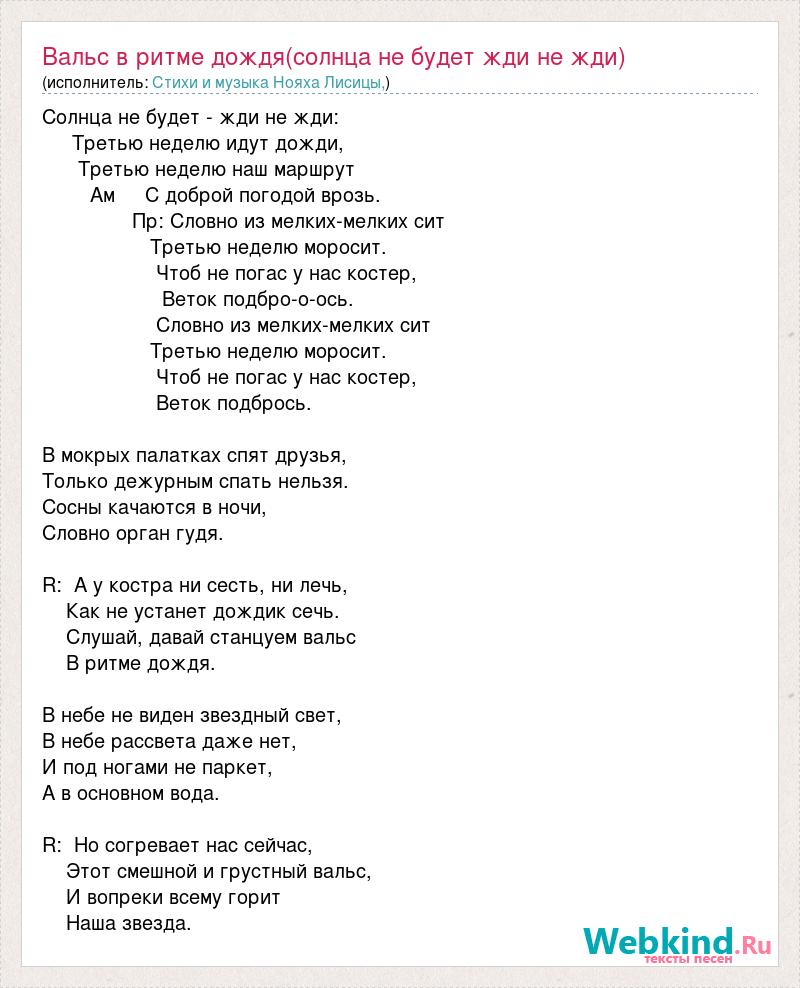 Главная→Исполнители→Стихи и музыка Нояха Лисицы, существенно фольклоризованные→Вальс в ритме дождя(солнца не будет жди не жди)