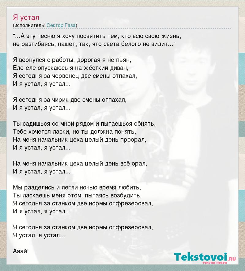 "...А эту песню я хочу посвятить тем, кто всю свою жизнь, не разгибаясь, пашет, так, что света белого не видит..." Я вернулся с работы, дорогая я не пьян, Еле-еле опускаюсь я на жёсткий диван, Я сегодня за червонец две смены отпахал, И я устал, я устал... Я сегодня за чирик две смены отпахал, И я устал, я устал... Ты садишься со мной рядом и пытаешься обнять, Тебе хочется ласки, но ты должна понять, На меня начальник цеха целый день проорал, И я устал, я устал... На меня начальник цеха целый день всё орал, И я устал, я устал... Мы разделись и легли ночью время любить, Ты ласкаешь меня ртом, пытаясь возбудить, Я сегодня за станком две нормы отфрезеровал, И я устал, я устал... Я сегодня за станком две нормы отфрезеровал, Я устал, я устал... Aаай!