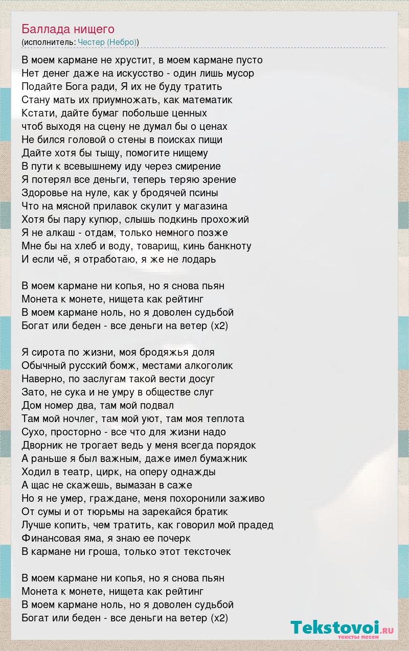 В моем кармане не хрустит, в моем кармане пусто Нет денег даже на искусство - один лишь мусор Подайте Бога ради, Я их не буду тратить Стану мать их приумножать, как математик Кстати, дайте бумаг побольше ценных чтоб выходя на сцену не думал бы о ценах Не бился головой о стены в поисках пищи Дайте хотя бы тыщу, помогите нищему В пути к всевышнему иду через смирение Я потерял все деньги, теперь теряю зрение Здоровье на нуле, как у бродячей псины Что на мясной прилавок скулит у магазина Хотя бы пару купюр, слышь подкинь прохожий Я не алкаш - отдам, только немного позже Мне бы на хлеб и воду, товарищ, кинь банкноту И если чё, я отработаю, я же не лодарь В моем кармане ни копья, но я снова пьян Монета к монете, нищета как рейтинг В моем кармане ноль, но я доволен судьбой Богат или беден - все деньги на ветер (х2) Я сирота по жизни, моя бродяжья доля Обычный русский бомж, местами алкоголик Наверно, по заслугам такой вести досуг Зато, не сука и не умру в обществе слуг Дом номер два, там мой подвал Там мой ночлег, там мой уют, там моя теплота Сухо, просторно - все что для жизни надо Дворник не трогает ведь у меня всегда порядок А раньше я был важным, даже имел бумажник Ходил в театр, цирк, на оперу однажды А щас не скажешь, вымазан в саже Но я не умер, граждане, меня похоронили заживо От сумы и от тюрьмы на зарекайся братик Лучше копить, чем тратить, как говорил мой прадед Финансовая яма, я знаю ее почерк В кармане ни гроша, только этот тексточек В моем кармане ни копья, но я снова пьян Монета к монете, нищета как рейтинг В моем кармане ноль, но я доволен судьбой Богат или беден - все деньги на ветер (х2)