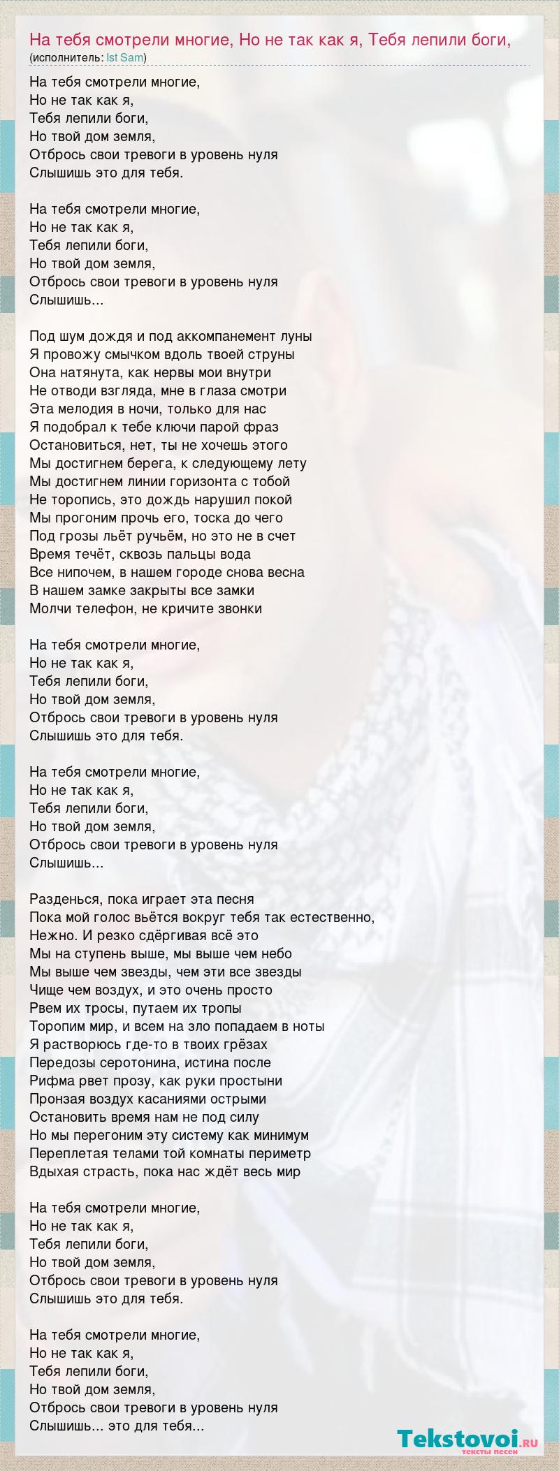 На тебя смотрели многие, Но не так как я, Тебя лепили боги, Но твой дом земля, Отбрось свои тревоги в уровень нуля Слышишь это для тебя. На тебя смотрели многие, Но не так как я, Тебя лепили боги, Но твой дом земля, Отбрось свои тревоги в уровень нуля Слышишь... Под шум дождя и под аккомпанемент луны Я провожу смычком вдоль твоей струны Она натянута, как нервы мои внутри Не отводи взгляда, мне в глаза смотри Эта мелодия в ночи, только для нас Я подобрал к тебе ключи парой фраз Остановиться, нет, ты не хочешь этого Мы достигнем берега, к следующему лету Мы достигнем линии горизонта с тобой Не торопись, это дождь нарушил покой Мы прогоним прочь его, тоска до чего Под грозы льёт ручьём, но это не в счет Время течёт, сквозь пальцы вода Все нипочем, в нашем городе снова весна В нашем замке закрыты все замки Молчи телефон, не кричите звонки На тебя смотрели многие, Но не так как я, Тебя лепили боги, Но твой дом земля, Отбрось свои тревоги в уровень нуля Слышишь это для тебя. На тебя смотрели многие, Но не так как я, Тебя лепили боги, Но твой дом земля, Отбрось свои тревоги в уровень нуля Слышишь... Разденься, пока играет эта песня Пока мой голос вьётся вокруг тебя так естественно, Нежно. И резко сдёргивая всё это Мы на ступень выше, мы выше чем небо Мы выше чем звезды, чем эти все звезды Чище чем воздух, и это очень просто Рвем их тросы, путаем их тропы Торопим мир, и всем на зло попадаем в ноты Я растворюсь где-то в твоих грёзах Передозы серотонина, истина после Рифма рвет прозу, как руки простыни Пронзая воздух касаниями острыми Остановить время нам не под силу Но мы перегоним эту систему как минимум Переплетая телами той комнаты периметр Вдыхая страсть, пока нас ждёт весь мир На тебя смотрели многие, Но не так как я, Тебя лепили боги, Но твой дом земля, Отбрось свои тревоги в уровень нуля Слышишь это для тебя. На тебя смотрели многие, Но не так как я, Тебя лепили боги, Но твой дом земля, Отбрось свои тревоги в уровень нуля Слышишь... это для тебя...