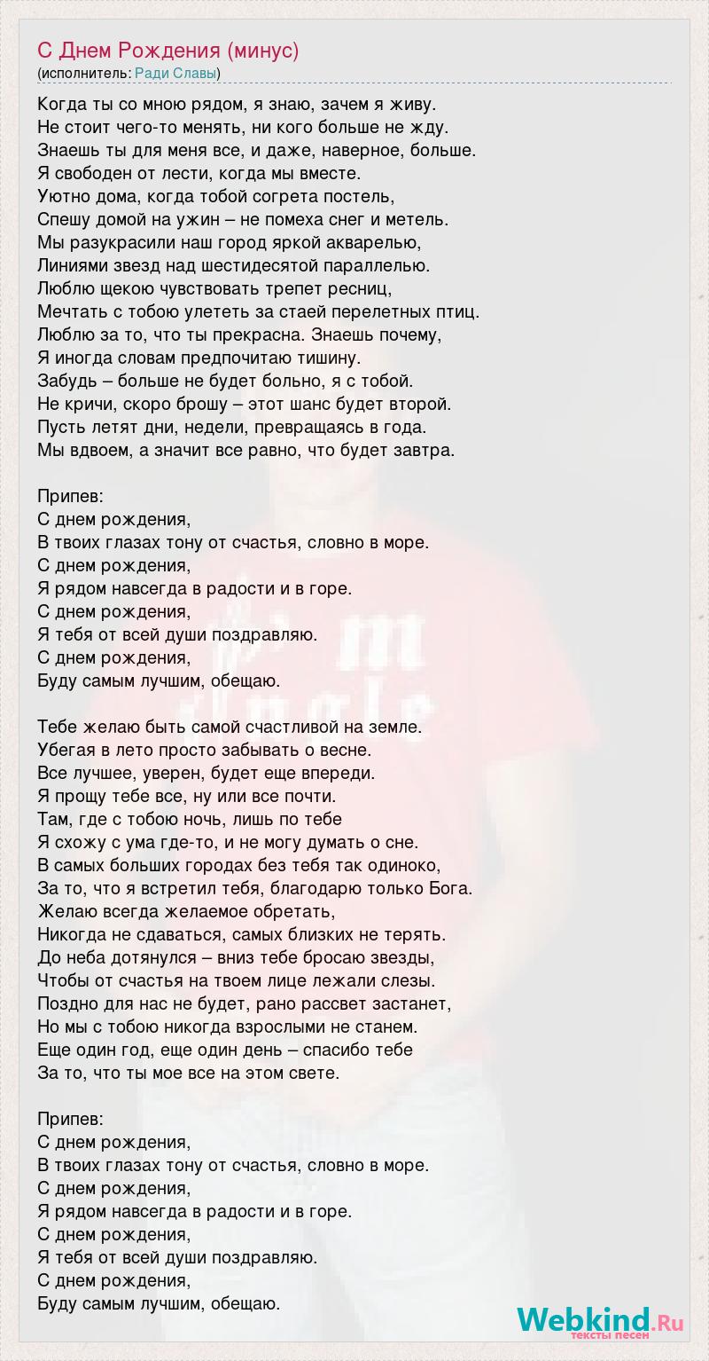 Когда ты со мною рядом, я знаю, зачем я живу. Не стоит чего-то менять, ни кого больше не жду. Знаешь ты для меня все, и даже, наверное, больше. Я свободен от лести, когда мы вместе. Уютно дома, когда тобой согрета постель, Спешу домой на ужин – не помеха снег и метель. Мы разукрасили наш город яркой акварелью, Линиями звезд над шестидесятой параллелью. Люблю щекою чувствовать трепет ресниц, Мечтать с тобою улететь за стаей перелетных птиц. Люблю за то, что ты прекрасна. Знаешь почему, Я иногда словам предпочитаю тишину. Забудь – больше не будет больно, я с тобой. Не кричи, скоро брошу – этот шанс будет второй. Пусть летят дни, недели, превращаясь в года. Мы вдвоем, а значит все равно, что будет завтра. Припев: С днем рождения, В твоих глазах тону от счастья, словно в море. С днем рождения, Я рядом навсегда в радости и в горе. С днем рождения, Я тебя от всей души поздравляю. С днем рождения, Буду самым лучшим, обещаю. Тебе желаю быть самой счастливой на земле. Убегая в лето просто забывать о весне. Все лучшее, уверен, будет еще впереди. Я прощу тебе все, ну или все почти. Там, где с тобою ночь, лишь по тебе Я схожу с ума где-то, и не могу думать о сне. В самых больших городах без тебя так одиноко, За то, что я встретил тебя, благодарю только Бога. Желаю всегда желаемое обретать, Никогда не сдаваться, самых близких не терять. До неба дотянулся – вниз тебе бросаю звезды, Чтобы от счастья на твоем лице лежали слезы. Поздно для нас не будет, рано рассвет застанет, Но мы с тобою никогда взрослыми не станем. Еще один год, еще один день – спасибо тебе За то, что ты мое все на этом свете. Припев: С днем рождения, В твоих глазах тону от счастья, словно в море. С днем рождения, Я рядом навсегда в радости и в горе. С днем рождения, Я тебя от всей души поздравляю. С днем рождения, Буду самым лучшим, обещаю.
