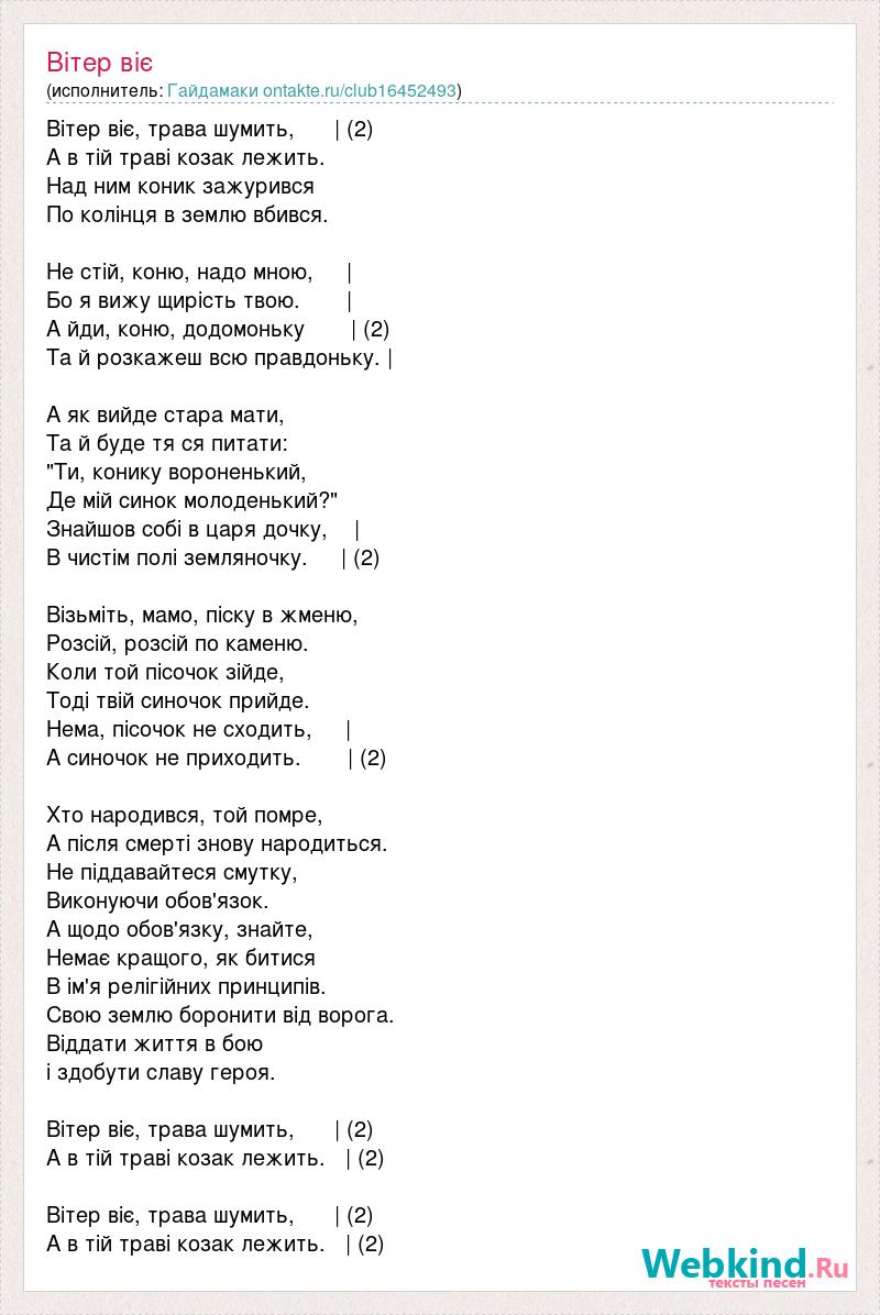 Вітер віє, трава шумить, | (2) А в тій траві козак лежить. Над ним коник зажурився По колінця в землю вбився. Не стій, коню, надо мною, | Бо я вижу щирість твою. | А йди, коню, додомоньку | (2) Та й розкажеш всю правдоньку. | А як вийде стара мати, Та й буде тя ся питати: "Ти, конику вороненький, Де мій синок молоденький?" Знайшов собі в царя дочку, | В чистім полі земляночку. | (2) Візьміть, мамо, піску в жменю, Розсій, розсій по каменю. Коли той пісочок зійде, Тоді твій синочок прийде. Нема, пісочок не сходить, | А синочок не приходить. | (2) Хто народився, той помре, А після смерті знову народиться. Не піддавайтеся смутку, Виконуючи обов'язок. А щодо обов'язку, знайте, Немає кращого, як битися В ім'я релігійних принципів. Свою землю боронити від ворога. Віддати життя в бою і здобути славу героя. Вітер віє, трава шумить, | (2) А в тій траві козак лежить. | (2) Вітер віє, трава шумить, | (2) А в тій траві козак лежить. | (2)