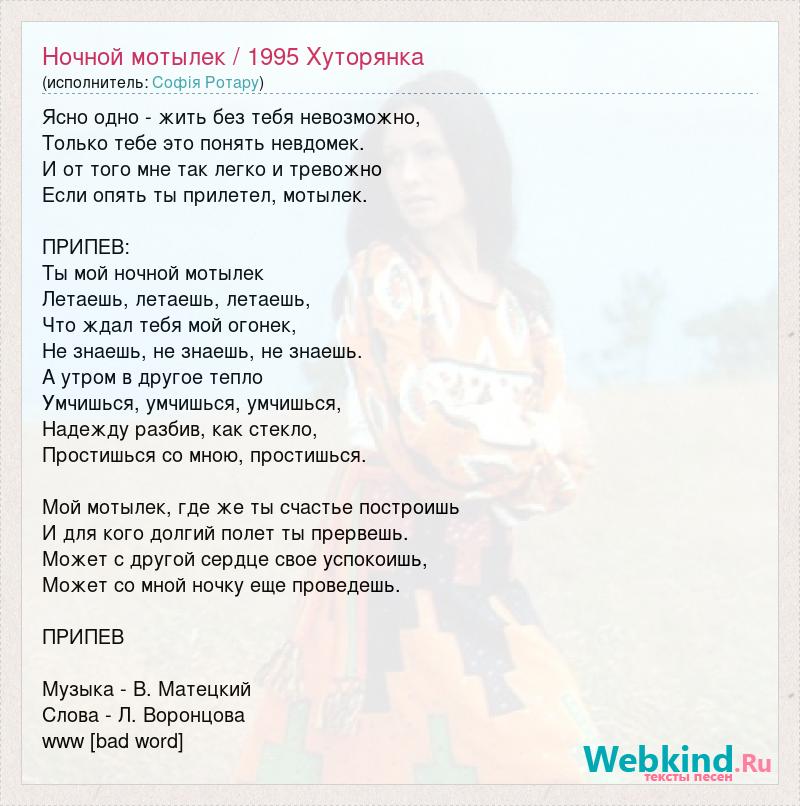 Ясно одно - жить без тебя невозможно, Только тебе это понять невдомек. И от того мне так легко и тревожно Если опять ты прилетел, мотылек. ПРИПЕВ: Ты мой ночной мотылек Летаешь, летаешь, летаешь, Что ждал тебя мой огонек, Не знаешь, не знаешь, не знаешь. А утром в другое тепло Умчишься, умчишься, умчишься, Надежду разбив, как стекло, Простишься со мною, простишься. Мой мотылек, где же ты счастье построишь И для кого долгий полет ты прервешь. Может с другой сердце свое успокоишь, Может со мной ночку еще проведешь. ПРИПЕВ Музыка - В. Матецкий Слова - Л. Воронцова www [bad word]