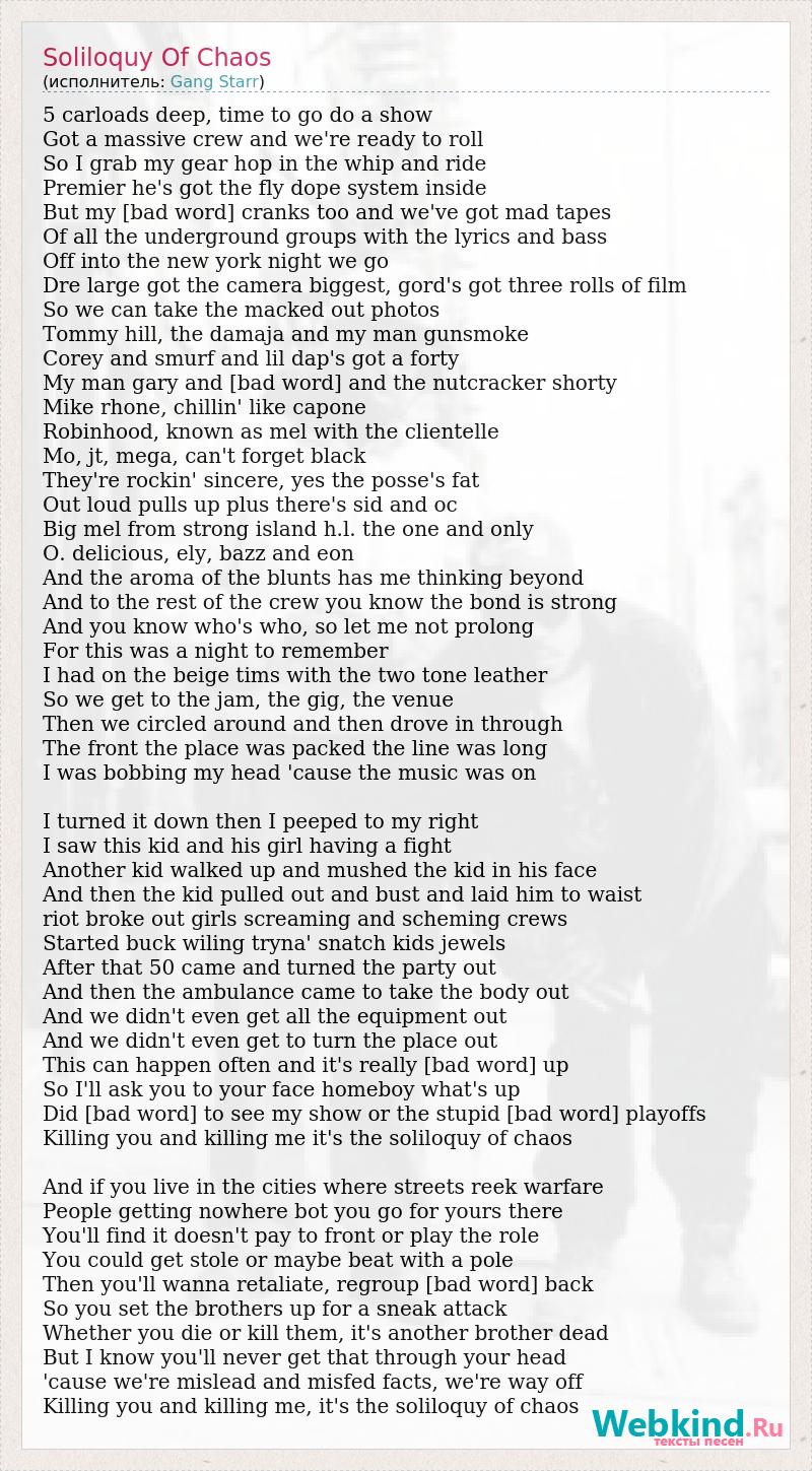 5 carloads deep, time to go do a show Got a massive crew and we're ready to roll So I grab my gear hop in the whip and ride Premier he's got the fly dope system inside But my [bad word] cranks too and we've got mad tapes Of all the underground groups with the lyrics and bass Off into the new york night we go Dre large got the camera biggest, gord's got three rolls of film So we can take the macked out photos Tommy hill, the damaja and my man gunsmoke Corey and smurf and lil dap's got a forty My man gary and [bad word] and the nutcracker shorty Mike rhone, chillin' like capone Robinhood, known as mel with the clientelle Mo, jt, mega, can't forget black They're rockin' sincere, yes the posse's fat Out loud pulls up plus there's sid and oc Big mel from strong island h.l. the one and only O. delicious, ely, bazz and eon And the aroma of the blunts has me thinking beyond And to the rest of the crew you know the bond is strong And you know who's who, so let me not prolong For this was a night to remember I had on the beige tims with the two tone leather So we get to the jam, the gig, the venue Then we circled around and then drove in through The front the place was packed the line was long I was bobbing my head 'cause the music was on I turned it down then I peeped to my right I saw this kid and his girl having a fight Another kid walked up and mushed the kid in his face And then the kid pulled out and bust and laid him to waist riot broke out girls screaming and scheming crews Started buck wiling tryna' snatch kids jewels After that 50 came and turned the party out And then the ambulance came to take the body out And we didn't even get all the equipment out And we didn't even get to turn the place out This can happen often and it's really [bad word] up So I'll ask you to your face homeboy what's up Did [bad word] to see my show or the stupid [bad word] playoffs Killing you and killing me it's the soliloquy of chaos And if you live in the cities where streets reek warfare People getting nowhere bot you go for yours there You'll find it doesn't pay to front or play the role You could get stole or maybe beat with a pole Then you'll wanna retaliate, regroup [bad word] back So you set the brothers up for a sneak attack Whether you die or kill them, it's another brother dead But I know you'll never get that through your head 'cause we're mislead and misfed facts, we're way off Killing you and killing me, it's the soliloquy of chaos