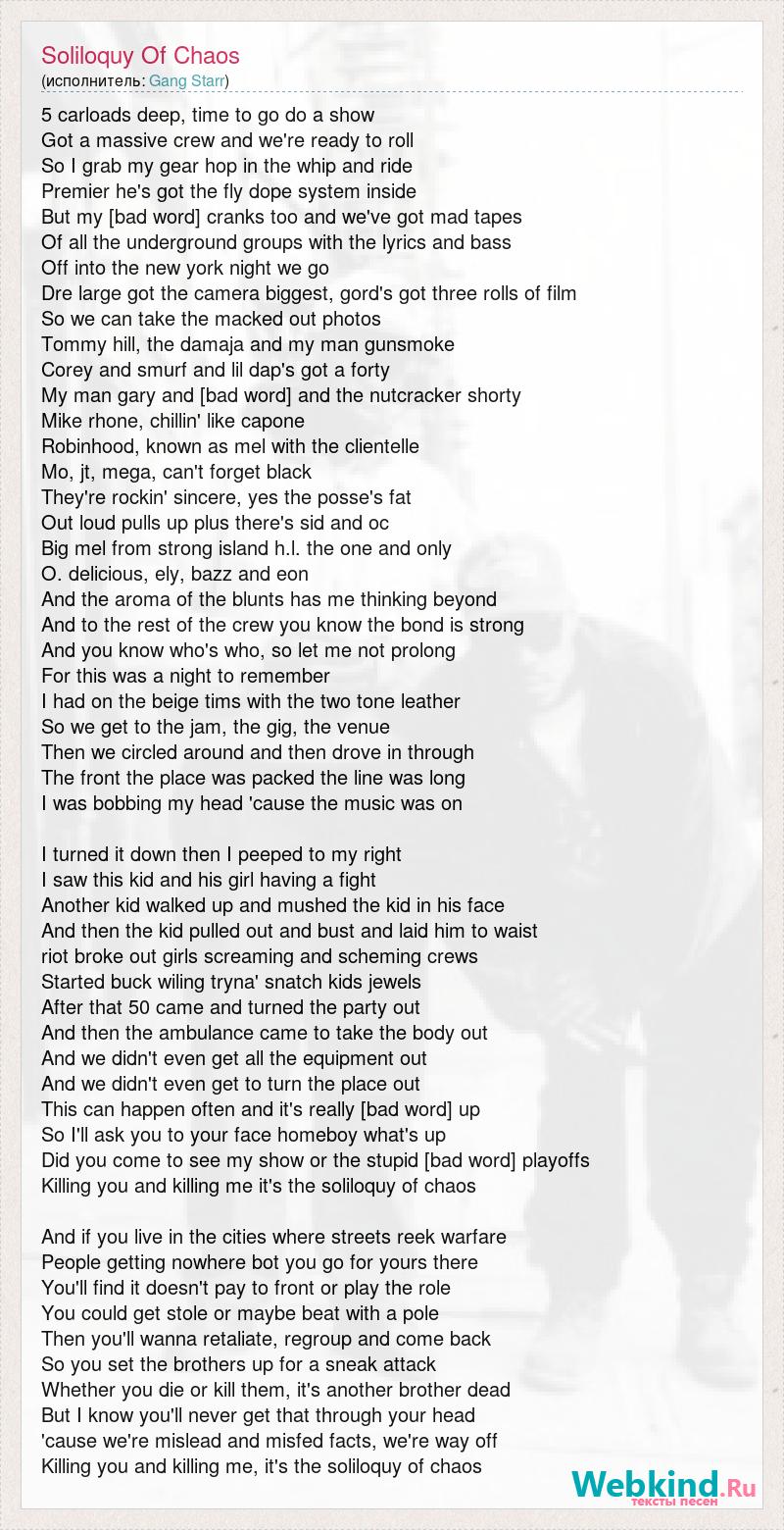 5 carloads deep, time to go do a show Got a massive crew and we're ready to roll So I grab my gear hop in the whip and ride Premier he's got the fly dope system inside But my [bad word] cranks too and we've got mad tapes Of all the underground groups with the lyrics and bass Off into the new york night we go Dre large got the camera biggest, gord's got three rolls of film So we can take the macked out photos Tommy hill, the damaja and my man gunsmoke Corey and smurf and lil dap's got a forty My man gary and [bad word] and the nutcracker shorty Mike rhone, chillin' like capone Robinhood, known as mel with the clientelle Mo, jt, mega, can't forget black They're rockin' sincere, yes the posse's fat Out loud pulls up plus there's sid and oc Big mel from strong island h.l. the one and only O. delicious, ely, bazz and eon And the aroma of the blunts has me thinking beyond And to the rest of the crew you know the bond is strong And you know who's who, so let me not prolong For this was a night to remember I had on the beige tims with the two tone leather So we get to the jam, the gig, the venue Then we circled around and then drove in through The front the place was packed the line was long I was bobbing my head 'cause the music was on I turned it down then I peeped to my right I saw this kid and his girl having a fight Another kid walked up and mushed the kid in his face And then the kid pulled out and bust and laid him to waist riot broke out girls screaming and scheming crews Started buck wiling tryna' snatch kids jewels After that 50 came and turned the party out And then the ambulance came to take the body out And we didn't even get all the equipment out And we didn't even get to turn the place out This can happen often and it's really [bad word] up So I'll ask you to your face homeboy what's up Did you come to see my show or the stupid [bad word] playoffs Killing you and killing me it's the soliloquy of chaos And if you live in the cities where streets reek warfare People getting nowhere bot you go for yours there You'll find it doesn't pay to front or play the role You could get stole or maybe beat with a pole Then you'll wanna retaliate, regroup and come back So you set the brothers up for a sneak attack Whether you die or kill them, it's another brother dead But I know you'll never get that through your head 'cause we're mislead and misfed facts, we're way off Killing you and killing me, it's the soliloquy of chaos