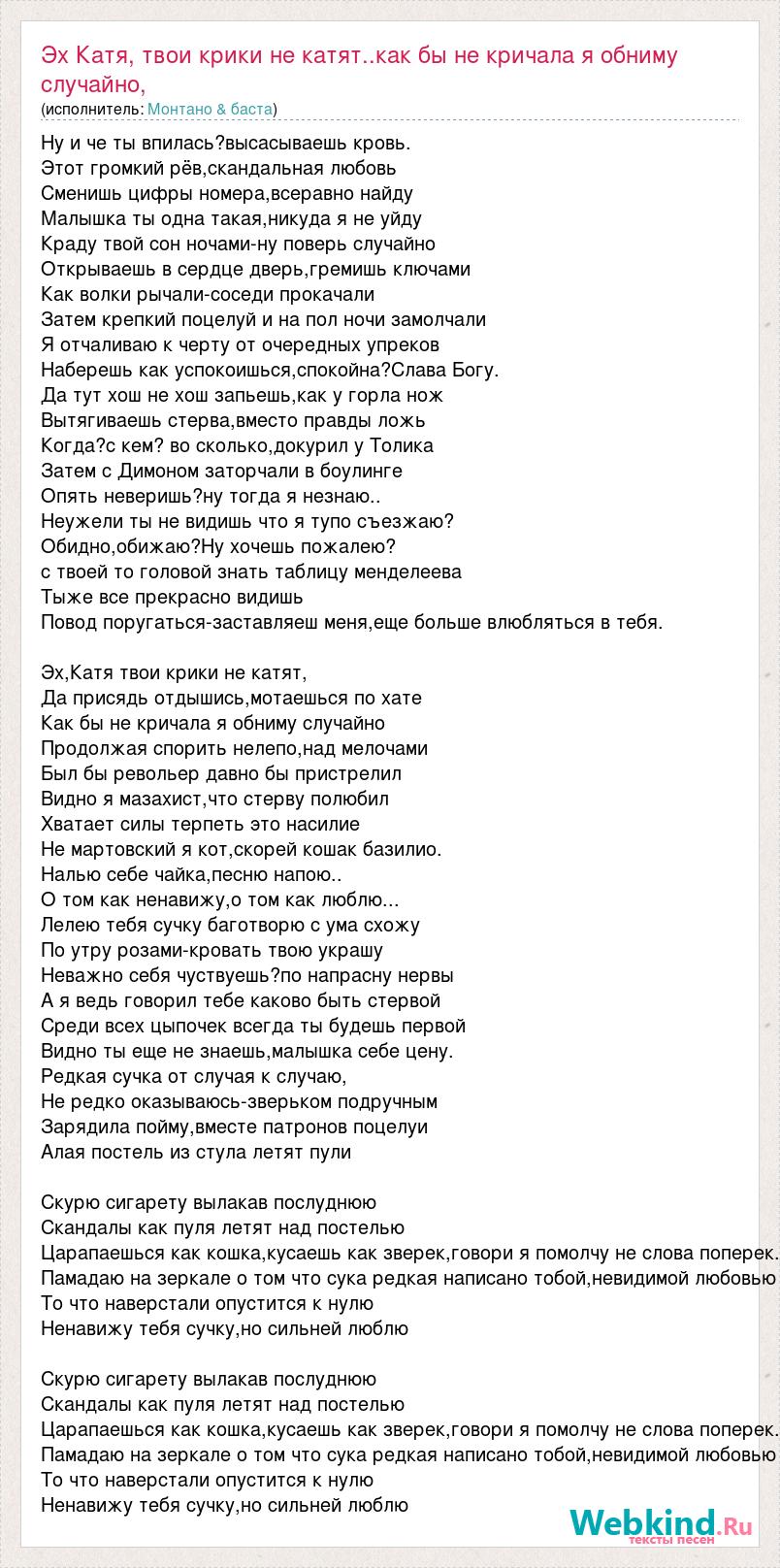 Ну и че ты впилась?высасываешь кровь. Этот громкий рёв,скандальная любовь Сменишь цифры номера,всеравно найду Малышка ты одна такая,никуда я не уйду Краду твой сон ночами-ну поверь случайно Открываешь в сердце дверь,гремишь ключами Как волки рычали-соседи прокачали Затем крепкий поцелуй и на пол ночи замолчали Я отчаливаю к черту от очередных упреков Наберешь как успокоишься,спокойна?Слава Богу. Да тут хош не хош запьешь,как у горла нож Вытягиваешь стерва,вместо правды ложь Когда?с кем? во сколько,докурил у Толика Затем с Димоном заторчали в боулинге Опять неверишь?ну тогда я незнаю.. Неужели ты не видишь что я тупо съезжаю? Обидно,обижаю?Ну хочешь пожалею? с твоей то головой знать таблицу менделеева Тыже все прекрасно видишь Повод поругаться-заставляеш меня,еще больше влюбляться в тебя. Эх,Катя твои крики не катят, Да присядь отдышись,мотаешься по хате Как бы не кричала я обниму случайно Продолжая спорить нелепо,над мелочами Был бы револьер давно бы пристрелил Видно я мазахист,что стерву полюбил Хватает силы терпеть это насилие Не мартовский я кот,скорей кошак базилио. Налью себе чайка,песню напою.. О том как ненавижу,о том как люблю... Лелею тебя сучку баготворю с ума схожу По утру розами-кровать твою украшу Неважно себя чуствуешь?по напрасну нервы А я ведь говорил тебе каково быть стервой Среди всех цыпочек всегда ты будешь первой Видно ты еще не знаешь,малышка себе цену. Редкая сучка от случая к случаю, Не редко оказываюсь-зверьком подручным Зарядила пойму,вместе патронов поцелуи Алая постель из стула летят пули Скурю сигарету вылакав послуднюю Скандалы как пуля летят над постелью Царапаешься как кошка,кусаешь как зверек,говори я помолчу не слова поперек. Памадаю на зеркале о том что сука редкая написано тобой,невидимой любовью То что наверстали опустится к нулю Ненавижу тебя сучку,но сильней люблю Скурю сигарету вылакав послуднюю Скандалы как пуля летят над постелью Царапаешься как кошка,кусаешь как зверек,говори я помолчу не слова поперек. Памадаю на зеркале о том что сука редкая написано тобой,невидимой любовью То что наверстали опустится к нулю Ненавижу тебя сучку,но сильней люблю