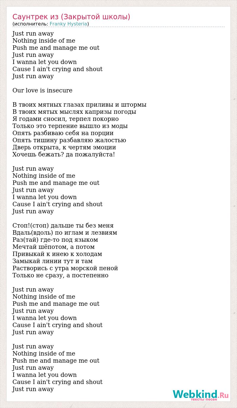 Just run away Nothing inside of me Push me and manage me out Just run away I wanna let you down Cause I ain't crying and shout Just run away Our love is insecure В твоих мятных глазах приливы и штормы В твоих мятых мыслях капризы погоды Я годами сносил, терпел покорно Только это терпение вышло из моды Опять разбиваю себя на порции Опять тишину разбавляю жалостью Дверь открыта, к чертям эмоции Хочешь бежать? да пожалуйста! Just run away Nothing inside of me Push me and manage me out Just run away I wanna let you down Cause I ain't crying and shout Just run away Стоп!(стоп) дальше ты без меня Вдаль(вдоль) по иглам и лезвиям Раз(тай) где-то под языком Мечтай шёпотом, а потом Привыкай к инею к холодам Замыкай линии тут и там Растворись с утра морской пеной Только не сразу, а постепенно Just run away Nothing inside of me Push me and manage me out Just run away I wanna let you down Cause I ain't crying and shout Just run away Just run away Nothing inside of me Push me and manage me out Just run away I wanna let you down Cause I ain't crying and shout Just run away