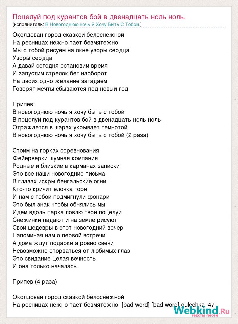 Околдован город сказкой белоснежной На ресницах нежно тает безмятежно Мы с тобой рисуем на окне узоры сердца Узоры сердца А давай сегодня остановим время И запустим стрелок бег наоборот На двоих одно желание загадаем Говорят мечты сбываются под новый год Припев: В новогоднюю ночь я хочу быть с тобой В поцелуй под курантов бой в двенадцать ноль ноль Отражается в шарах укрывает темнотой В новогоднюю ночь я хочу быть с тобой (2 раза) Стоим на горках соревнования Фейерверки шумная компания Родные и близкие в карманах записки Это все наши новогодние письма В глазах искры бенгальские огни Кто-то кричит елочка гори И нам с тобой подмигнули фонари Это был знак чтобы обнялись мы Идем вдоль парка ловлю твои поцелуи Снежинки падают и на земле рисуют Свои шедевры в этот новогодний вечер Напоминая нам о первой встречи А дома ждут подарки а ровно свечи Невозможно оторваться от любимых глаз Это свидание целая вечность И она только началась Припев (4 раза) Околдован город сказкой белоснежной На ресницах нежно тает безмятежно [bad word] [bad word] gulechka_47