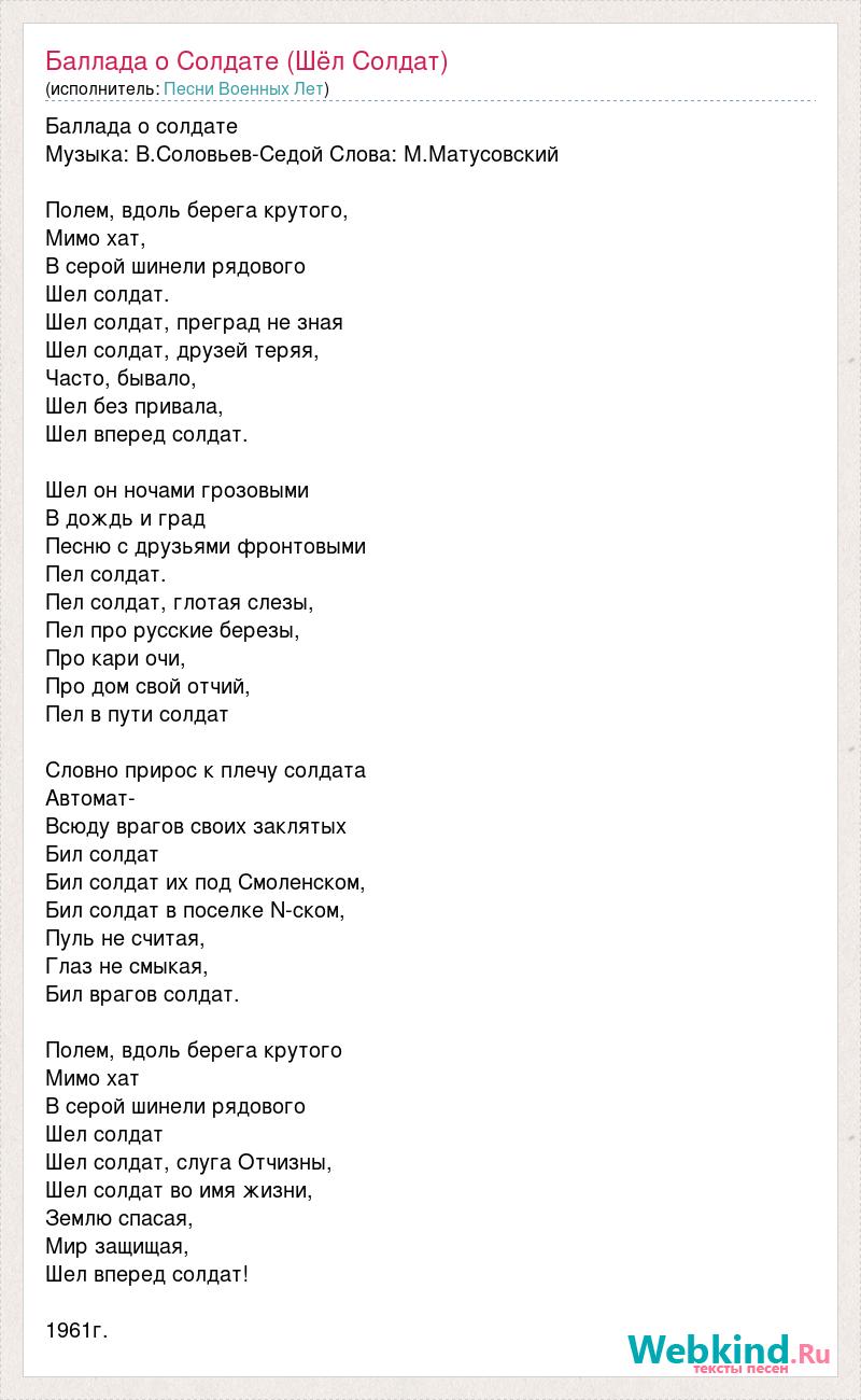 Баллада о солдате Музыка: В.Соловьев-Седой Слова: М.Матусовский Полем, вдоль берега крутого, Мимо хат, В серой шинели рядового Шел солдат. Шел солдат, преград не зная Шел солдат, друзей теряя, Часто, бывало, Шел без привала, Шел вперед солдат. Шел он ночами грозовыми В дождь и град Песню с друзьями фронтовыми Пел солдат. Пел солдат, глотая слезы, Пел про русские березы, Про кари очи, Про дом свой отчий, Пел в пути солдат Словно прирос к плечу солдата Автомат- Всюду врагов своих заклятых Бил солдат Бил солдат их под Смоленском, Бил солдат в поселке N-ском, Пуль не считая, Глаз не смыкая, Бил врагов солдат. Полем, вдоль берега крутого Мимо хат В серой шинели рядового Шел солдат Шел солдат, слуга Отчизны, Шел солдат во имя жизни, Землю спасая, Мир защищая, Шел вперед солдат! 1961г.