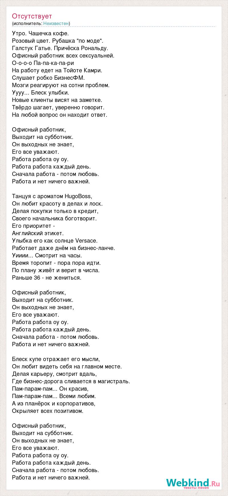 Утро. Чашечка кофе. Розовый цвет. Рубашка "по моде". Галстук Гатье. Причёска Рональду. Офисный работник всех сексуальней. О-о-о-о Па-па-ка-па-ри На работу едет на Тойоте Камри. Слушает робко БизнесФМ. Мозги реагируют на сотни проблем. Уууу... Блеск улыбки. Новые клиенты висят на заметке. Твёрдо шагает, уверенно говорит. На любой вопрос он находит ответ. Офисный работник, Выходит на субботник. Он выходных не знает, Его все уважают. Работа работа оу оу. Работа работа каждый день. Сначала работа - потом любовь. Работа и нет ничего важней. Танцуя с ароматом HugoBoss, Он любит красоту в делах и лоск. Делая покупки только в кредит, Своего начальника боготворит. Его приоритет - Английский этикет. Улыбка его как солнце Versace. Работает даже днём на бизнес-ланче. Уииии... Смотрит на часы. Время торопит - пора пора идти. По плану живёт и верит в числа. Раньше 36 - не жениться. Офисный работник, Выходит на субботник. Он выходных не знает, Его все уважают. Работа работа оу оу. Работа работа каждый день. Сначала работа - потом любовь. Работа и нет ничего важней. Блеск купе отражает его мысли, Он любит видеть себя на главном месте. Делая карьеру, смотрит вдаль, Где бизнес-дорога сливается в магистраль. Пам-парам-пам... Он красив, Пам-парам-пам... Всеми любим. А из планёрок и корпоративов, Окрыляет всех позитивом. Офисный работник, Выходит на субботник. Он выходных не знает, Его все уважают. Работа работа оу оу. Работа работа каждый день. Сначала работа - потом любовь. Работа и нет ничего важней.