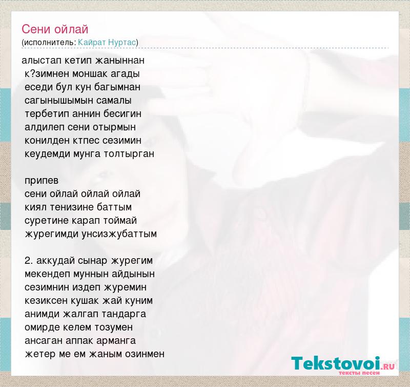 алыстап кетип жаныннан к?зимнен моншак агады еседи бул кун багымнан сагынышымын самалы тербетип аннин бесигин алдилеп сени отырмын конилден ктпес сезимин кеудемди мунга толтырган припев сени ойлай ойлай ойлай киял тенизине баттым суретине карап тоймай журегимди унсизжубаттым 2. аккудай сынар журегим мекендеп муннын айдынын сезимнин издеп журемин кезиксен кушак жай куним анимди жалгап тандарга омирде келем тозумен ансаган аппак арманга жетер ме ем жаным озинмен