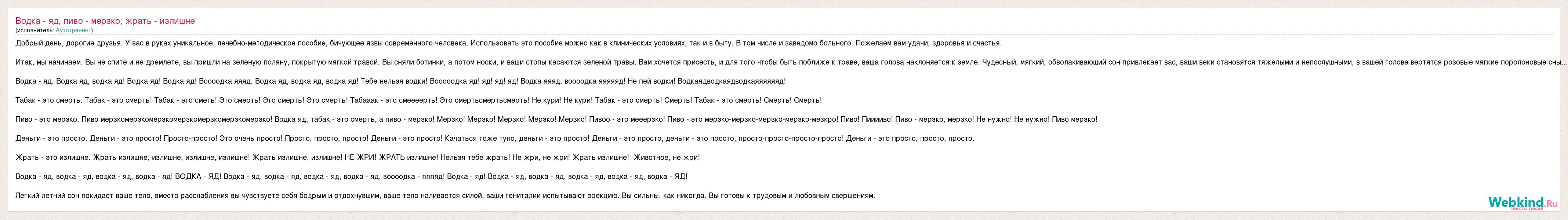 Добрый день, дорогие друзья. У вас в руках уникальное, лечебно-методическое пособие, бичующее язвы современного человека. Использовать это пособие можно как в клинических условиях, так и в быту. В том числе и заведомо больного. Пожелаем вам удачи, здоровья и счастья. Итак, мы начинаем. Вы не спите и не дремлете, вы пришли на зеленую поляну, покрытую мягкой травой. Вы сняли ботинки, а потом носки, и ваши стопы касаются зеленой травы. Вам хочется присесть, и для того чтобы быть поближе к траве, ваша голова наклоняется к земле. Чудесный, мягкий, обволакивающий сон привлекает вас, ваши веки становятся тяжелыми и непослушными, в вашей голове вертятся розовые мягкие поролоновые сны... Водка - яд. Водка яд, водка яд! Водка яд! Водка яд! Воооодка яяяд. Водка яд, водка яд, водка яд! Тебе нельзя водки! Вооооодка яд! яд! яд! яд! Водка яяяд, воооодка яяяяяд! Не пей водки! Водкаядводкаядводкаяяяяяяд! Табак - это смерть. Табак - это смерть! Табак - это сметь! Это смерть! Это смерть! Это смерть! Табааак - это смеееерть! Это смертьсмертьсмерть! Не кури! Не кури! Табак - это смерть! Смерть! Табак - это смерть! Смерть! Смерть! Пиво - это мерзко. Пиво мерзкомерзкомерзкомерзкомерзкомерзкомерзко! Водка яд, табак - это смерть, а пиво - мерзко! Мерзко! Мерзко! Мерзко! Мерзко! Мерзко! Пивоо - это мееерзко! Пиво - это мерзко-мерзко-мерзко-мерзко-мезкро! Пиво! Пииииво! Пиво - мерзко, мерзко! Не нужно! Не нужно! Пиво мерзко! Деньги - это просто. Деньги - это просто! Просто-просто! Это очень просто! Просто, просто, просто! Деньги - это просто! Качаться тоже тупо, деньги - это просто! Деньги - это просто, деньги - это просто, просто-просто-просто-просто! Деньги - это просто, просто, просто. Жрать - это излишне. Жрать излишне, излишне, излишне, излишне! Жрать излишне, излишне! НЕ ЖРИ! ЖРАТЬ излишне! Нельзя тебе жрать! Не жри, не жри! Жрать излишне! Животное, не жри! Водка - яд, водка - яд, водка - яд, водка - яд! ВОДКА - ЯД! Водка - яд, водка - яд, водка - яд, водка - яд, воооодка - яяяяд! Водка - яд! Водка - яд, водка - яд, водка - яд, водка - яд, водка - ЯД! Легкий летний сон покидает ваше тело, вместо расслабления вы чувствуете себя бодрым и отдохнувшим, ваше тело наливается силой, ваши гениталии испытывают эрекцию. Вы сильны, как никогда. Вы готовы к трудовым и любовным свершениям.