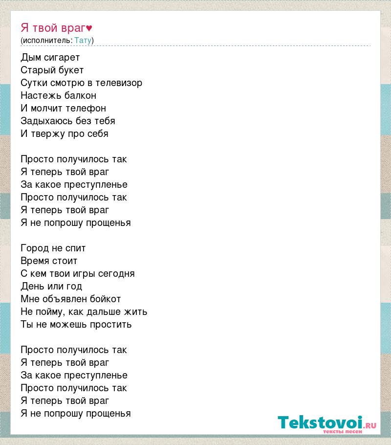 Дым сигарет Старый букет Сутки смотрю в телевизор Настежь балкон И молчит телефон Задыхаюсь без тебя И твержу про себя Просто получилось так Я теперь твой враг За какое преступленье Просто получилось так Я теперь твой враг Я не попрошу прощенья Город не спит Время стоит С кем твои игры сегодня День или год Мне объявлен бойкот Не пойму, как дальше жить Ты не можешь простить Просто получилось так Я теперь твой враг За какое преступленье Просто получилось так Я теперь твой враг Я не попрошу прощенья