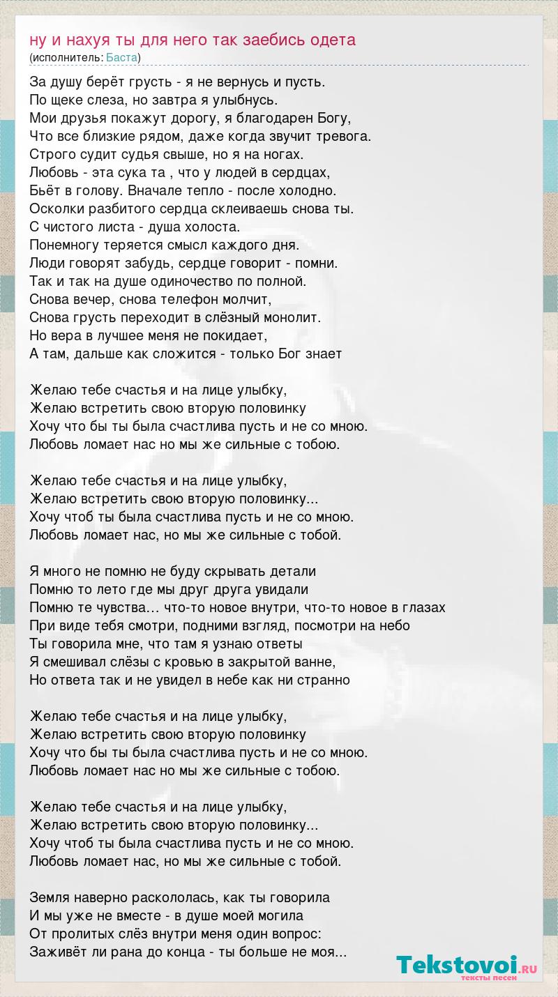 За душу берёт грусть - я не вернусь и пусть. По щеке слеза, но завтра я улыбнусь. Мои друзья покажут дорогу, я благодарен Богу, Что все близкие рядом, даже когда звучит тревога. Строго судит судья свыше, но я на ногах. Любовь - эта сука та , что у людей в сердцах, Бьёт в голову. Вначале тепло - после холодно. Осколки разбитого сердца склеиваешь снова ты. С чистого листа - душа холоста. Понемногу теряется смысл каждого дня. Люди говорят забудь, сердце говорит - помни. Так и так на душе одиночество по полной. Снова вечер, снова телефон молчит, Снова грусть переходит в слёзный монолит. Но вера в лучшее меня не покидает, А там, дальше как сложится - только Бог знает Желаю тебе счастья и на лице улыбку, Желаю встретить свою вторую половинку Хочу что бы ты была счастлива пусть и не со мною. Любовь ломает нас но мы же сильные с тобою. Желаю тебе счастья и на лице улыбку, Желаю встретить свою вторую половинку... Хочу чтоб ты была счастлива пусть и не со мною. Любовь ломает нас, но мы же сильные с тобой. Я много не помню не буду скрывать детали Помню то лето где мы друг друга увидали Помню те чувства… что-то новое внутри, что-то новое в глазах При виде тебя смотри, подними взгляд, посмотри на небо Ты говорила мне, что там я узнаю ответы Я смешивал слёзы с кровью в закрытой ванне, Но ответа так и не увидел в небе как ни странно Желаю тебе счастья и на лице улыбку, Желаю встретить свою вторую половинку Хочу что бы ты была счастлива пусть и не со мною. Любовь ломает нас но мы же сильные с тобою. Желаю тебе счастья и на лице улыбку, Желаю встретить свою вторую половинку... Хочу чтоб ты была счастлива пусть и не со мною. Любовь ломает нас, но мы же сильные с тобой. Земля наверно раскололась, как ты говорила И мы уже не вместе - в душе моей могила От пролитых слёз внутри меня один вопрос: Заживёт ли рана до конца - ты больше не моя...
