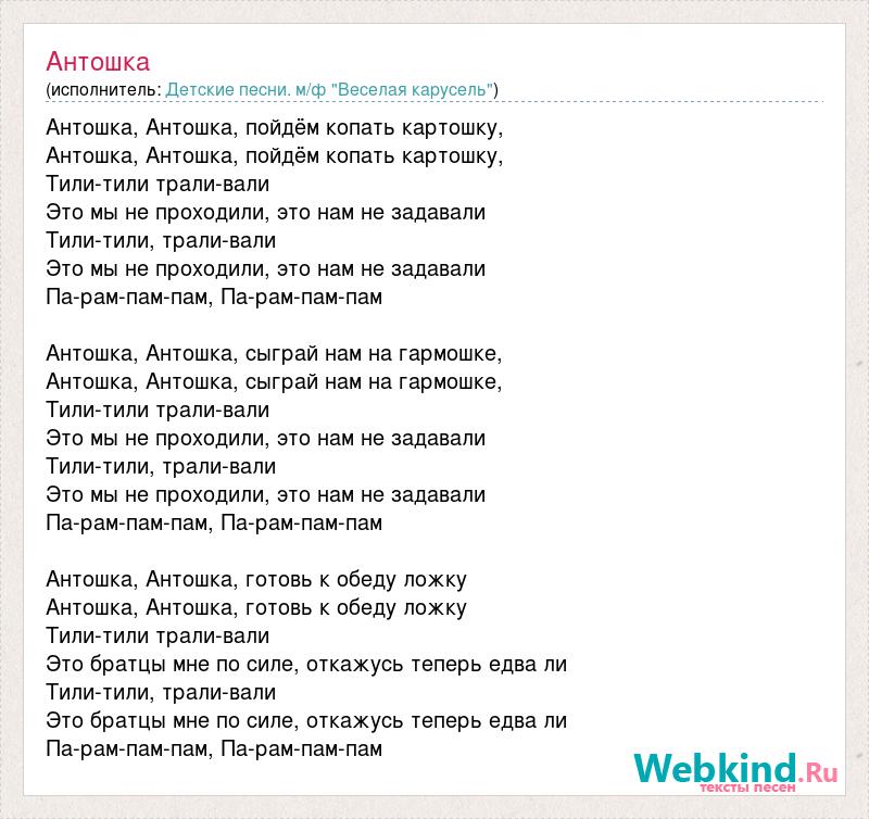 Антошка, Антошка, пойдём копать картошку, Антошка, Антошка, пойдём копать картошку, Тили-тили трали-вали Это мы не проходили, это нам не задавали Тили-тили, трали-вали Это мы не проходили, это нам не задавали Па-рам-пам-пам, Па-рам-пам-пам Антошка, Антошка, сыграй нам на гармошке, Антошка, Антошка, сыграй нам на гармошке, Тили-тили трали-вали Это мы не проходили, это нам не задавали Тили-тили, трали-вали Это мы не проходили, это нам не задавали Па-рам-пам-пам, Па-рам-пам-пам Антошка, Антошка, готовь к обеду ложку Антошка, Антошка, готовь к обеду ложку Тили-тили трали-вали Это братцы мне по силе, откажусь теперь едва ли Тили-тили, трали-вали Это братцы мне по силе, откажусь теперь едва ли Па-рам-пам-пам, Па-рам-пам-пам