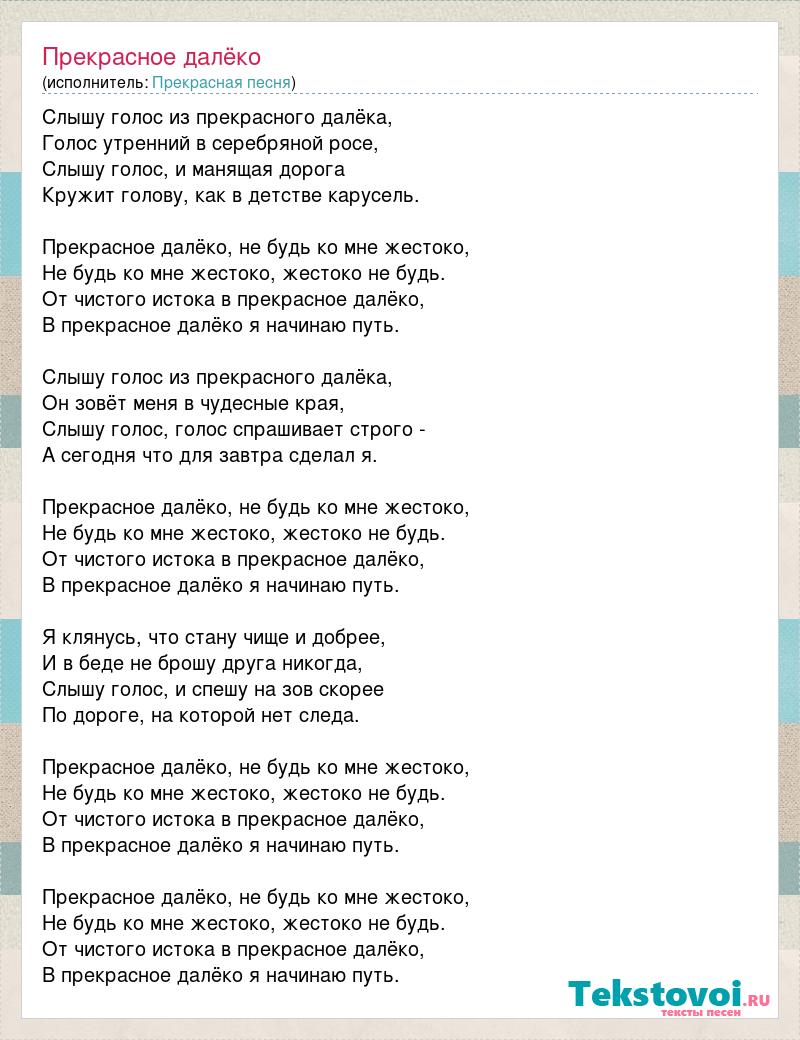 Слышу голос из прекрасного далёка, Голос утренний в серебряной росе, Слышу голос, и манящая дорога Кружит голову, как в детстве карусель. Прекрасное далёко, не будь ко мне жестоко, Не будь ко мне жестоко, жестоко не будь. От чистого истока в прекрасное далёко, В прекрасное далёко я начинаю путь. Слышу голос из прекрасного далёка, Он зовёт меня в чудесные края, Слышу голос, голос спрашивает строго - А сегодня что для завтра сделал я. Прекрасное далёко, не будь ко мне жестоко, Не будь ко мне жестоко, жестоко не будь. От чистого истока в прекрасное далёко, В прекрасное далёко я начинаю путь. Я клянусь, что стану чище и добрее, И в беде не брошу друга никогда, Слышу голос, и спешу на зов скорее По дороге, на которой нет следа. Прекрасное далёко, не будь ко мне жестоко, Не будь ко мне жестоко, жестоко не будь. От чистого истока в прекрасное далёко, В прекрасное далёко я начинаю путь. Прекрасное далёко, не будь ко мне жестоко, Не будь ко мне жестоко, жестоко не будь. От чистого истока в прекрасное далёко, В прекрасное далёко я начинаю путь.