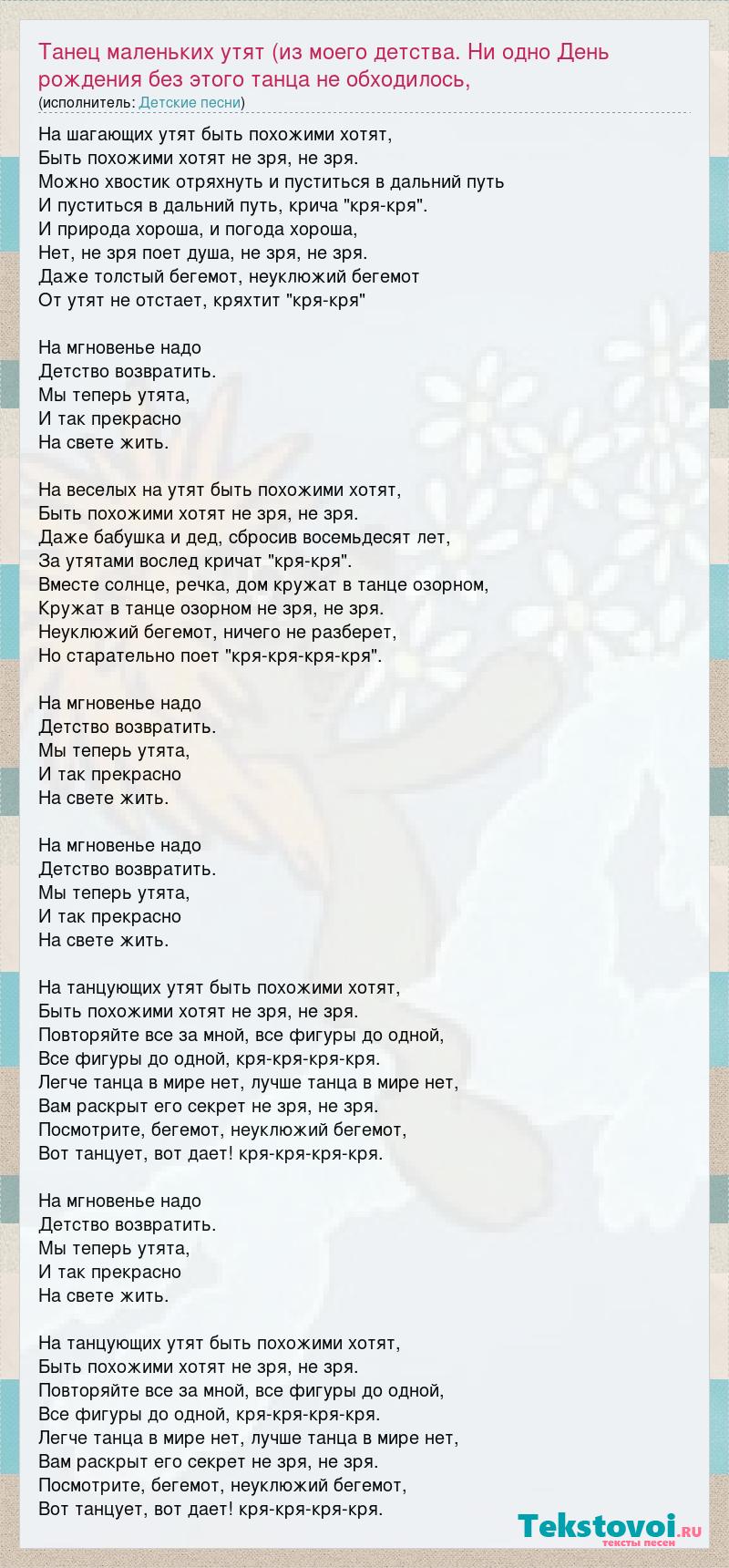 На шагающих утят быть похожими хотят, Быть похожими хотят не зря, не зря. Можно хвостик отряхнуть и пуститься в дальний путь И пуститься в дальний путь, крича "кря-кря". И природа хороша, и погода хороша, Нет, не зря поет душа, не зря, не зря. Даже толстый бегемот, неуклюжий бегемот От утят не отстает, кряхтит "кря-кря" На мгновенье надо Детство возвратить. Мы теперь утята, И так прекрасно На свете жить. На веселых на утят быть похожими хотят, Быть похожими хотят не зря, не зря. Даже бабушка и дед, сбросив восемьдесят лет, За утятами вослед кричат "кря-кря". Вместе солнце, речка, дом кружат в танце озорном, Кружат в танце озорном не зря, не зря. Неуклюжий бегемот, ничего не разберет, Но старательно поет "кря-кря-кря-кря". На мгновенье надо Детство возвратить. Мы теперь утята, И так прекрасно На свете жить. На мгновенье надо Детство возвратить. Мы теперь утята, И так прекрасно На свете жить. На танцующих утят быть похожими хотят, Быть похожими хотят не зря, не зря. Повторяйте все за мной, все фигуры до одной, Все фигуры до одной, кря-кря-кря-кря. Легче танца в мире нет, лучше танца в мире нет, Вам раскрыт его секрет не зря, не зря. Посмотрите, бегемот, неуклюжий бегемот, Вот танцует, вот дает! кря-кря-кря-кря. На мгновенье надо Детство возвратить. Мы теперь утята, И так прекрасно На свете жить. На танцующих утят быть похожими хотят, Быть похожими хотят не зря, не зря. Повторяйте все за мной, все фигуры до одной, Все фигуры до одной, кря-кря-кря-кря. Легче танца в мире нет, лучше танца в мире нет, Вам раскрыт его секрет не зря, не зря. Посмотрите, бегемот, неуклюжий бегемот, Вот танцует, вот дает! кря-кря-кря-кря.