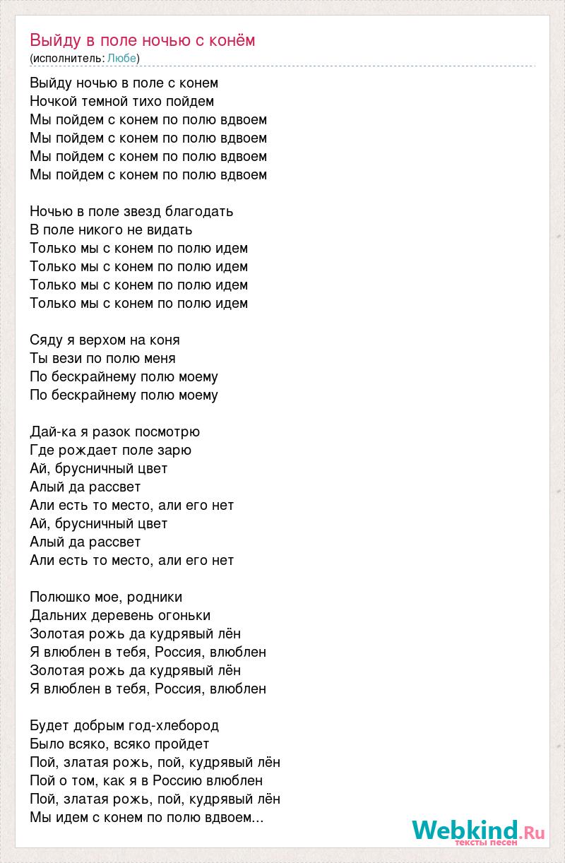 Выйду ночью в поле с конем Ночкой темной тихо пойдем Мы пойдем с конем по полю вдвоем Мы пойдем с конем по полю вдвоем Мы пойдем с конем по полю вдвоем Мы пойдем с конем по полю вдвоем Ночью в поле звезд благодать В поле никого не видать Только мы с конем по полю идем Только мы с конем по полю идем Только мы с конем по полю идем Только мы с конем по полю идем Сяду я верхом на коня Ты вези по полю меня По бескрайнему полю моему По бескрайнему полю моему Дай-ка я разок посмотрю Где рождает поле зарю Ай, брусничный цвет Алый да рассвет Али есть то место, али его нет Ай, брусничный цвет Алый да рассвет Али есть то место, али его нет Полюшко мое, родники Дальних деревень огоньки Золотая рожь да кудрявый лён Я влюблен в тебя, Россия, влюблен Золотая рожь да кудрявый лён Я влюблен в тебя, Россия, влюблен Будет добрым год-хлебород Было всяко, всяко пройдет Пой, златая рожь, пой, кудрявый лён Пой о том, как я в Россию влюблен Пой, златая рожь, пой, кудрявый лён Мы идем с конем по полю вдвоем...