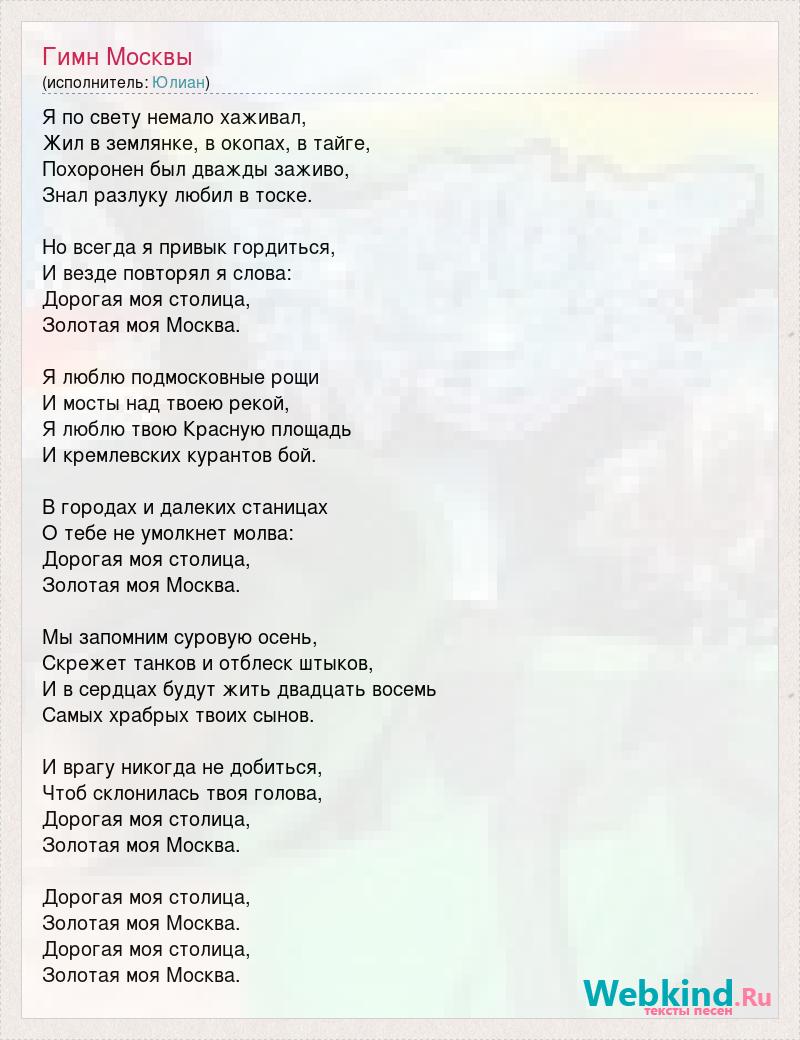 Я по свету немало хаживал, Жил в землянке, в окопах, в тайге, Похоронен был дважды заживо, Знал разлуку любил в тоске. Но всегда я привык гордиться, И везде повторял я слова: Дорогая моя столица, Золотая моя Москва. Я люблю подмосковные рощи И мосты над твоею рекой, Я люблю твою Красную площадь И кремлевских курантов бой. В городах и далеких станицах О тебе не умолкнет молва: Дорогая моя столица, Золотая моя Москва. Мы запомним суровую осень, Скрежет танков и отблеск штыков, И в сердцах будут жить двадцать восемь Самых храбрых твоих сынов. И врагу никогда не добиться, Чтоб склонилась твоя голова, Дорогая моя столица, Золотая моя Москва. Дорогая моя столица, Золотая моя Москва. Дорогая моя столица, Золотая моя Москва.