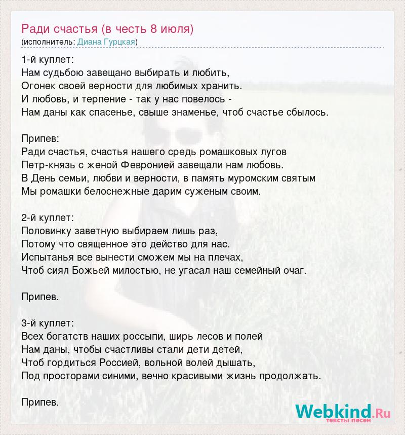1-й куплет: Нам судьбою завещано выбирать и любить, Огонек своей верности для любимых хранить. И любовь, и терпение - так у нас повелось - Нам даны как спасенье, свыше знаменье, чтоб счастье сбылось. Припев: Ради счастья, счастья нашего средь ромашковых лугов Петр-князь с женой Февронией завещали нам любовь. В День семьи, любви и верности, в память муромским святым Мы ромашки белоснежные дарим суженым своим. 2-й куплет: Половинку заветную выбираем лишь раз, Потому что священное это действо для нас. Испытанья все вынести сможем мы на плечах, Чтоб сиял Божьей милостью, не угасал наш семейный очаг. Припев. 3-й куплет: Всех богатств наших россыпи, ширь лесов и полей Нам даны, чтобы счастливы стали дети детей, Чтоб гордиться Россией, вольной волей дышать, Под просторами синими, вечно красивыми жизнь продолжать. Припев.