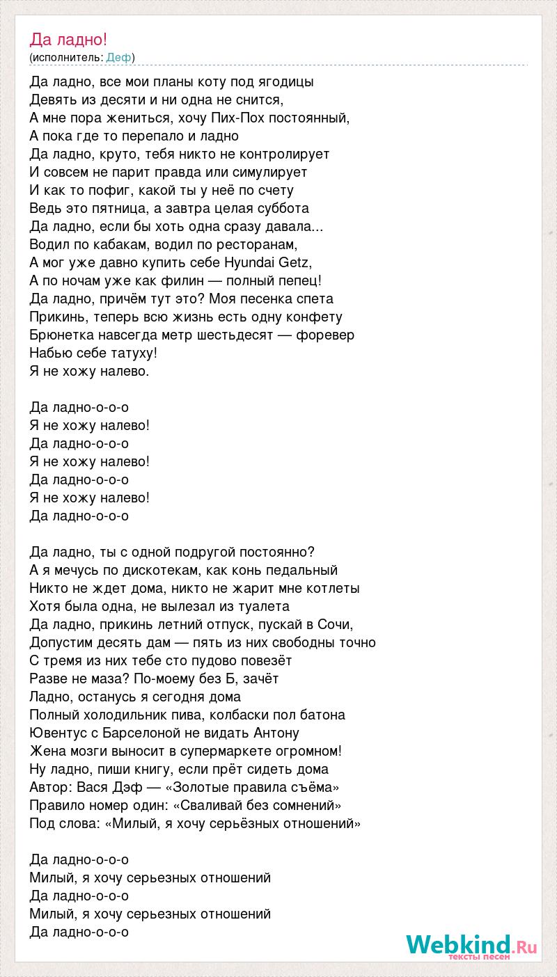 Да ладно, все мои планы коту под ягодицы Девять из десяти и ни одна не снится, А мне пора жениться, хочу Пих-Пох постоянный, А пока где то перепало и ладно Да ладно, круто, тебя никто не контролирует И совсем не парит правда или симулирует И как то пофиг, какой ты у неё по счету Ведь это пятница, а завтра целая суббота Да ладно, если бы хоть одна сразу давала... Водил по кабакам, водил по ресторанам, А мог уже давно купить себе Hyundai Getz, А по ночам уже как филин — полный пепец! Да ладно, причём тут это? Моя песенка спета Прикинь, теперь всю жизнь есть одну конфету Брюнетка навсегда метр шестьдесят — форевер Набью себе татуху! Я не хожу налево. Да ладно-о-о-о Я не хожу налево! Да ладно-о-о-о Я не хожу налево! Да ладно-о-о-о Я не хожу налево! Да ладно-о-о-о Да ладно, ты с одной подругой постоянно? А я мечусь по дискотекам, как конь педальный Никто не ждет дома, никто не жарит мне котлеты Хотя была одна, не вылезал из туалета Да ладно, прикинь летний отпуск, пускай в Сочи, Допустим десять дам — пять из них свободны точно С тремя из них тебе сто пудово повезёт Разве не маза? По-моему без Б, зачёт Ладно, останусь я сегодня дома Полный холодильник пива, колбаски пол батона Ювентус с Барселоной не видать Антону Жена мозги выносит в супермаркете огромном! Ну ладно, пиши книгу, если прёт сидеть дома Автор: Вася Дэф — «Золотые правила съёма» Правило номер один: «Сваливай без сомнений» Под слова: «Милый, я хочу серьёзных отношений» Да ладно-о-о-о Милый, я хочу серьезных отношений Да ладно-о-о-о Милый, я хочу серьезных отношений Да ладно-о-о-о