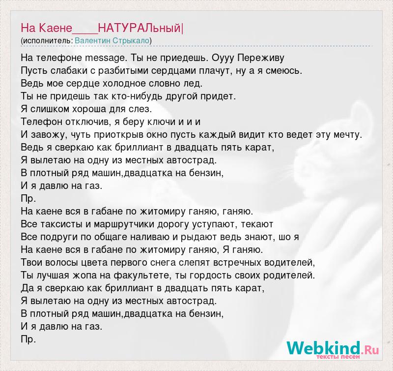 На телефоне message. Ты не приедешь. Оууу Переживу Пусть слабаки с разбитыми сердцами плачут, ну а я смеюсь. Ведь мое сердце холодное словно лед. Ты не придешь так кто-нибудь другой придет. Я слишком хороша для слез. Телефон отключив, я беру ключи и и и И завожу, чуть приоткрыв окно пусть каждый видит кто ведет эту мечту. Ведь я сверкаю как бриллиант в двадцать пять карат, Я вылетаю на одну из местных автострад. В плотный ряд машин,двадцатка на бензин, И я давлю на газ. Пр. На каене вся в габане по житомиру ганяю, ганяю. Все таксисты и маршрутчики дорогу уступают, текают Все подруги по общаге наливаю и рыдают ведь знают, шо я На каене вся в габане по житомиру ганяю, Я ганяю. Твои волосы цвета первого снега слепят встречных водителей, Ты лучшая жопа на факультете, ты гордость своих родителей. Да я сверкаю как бриллиант в двадцать пять карат, Я вылетаю на одну из местных автострад. В плотный ряд машин,двадцатка на бензин, И я давлю на газ. Пр.