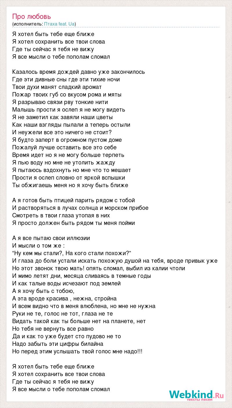 Я хотел быть тебе еще ближе Я хотел сохранить все твои слова Где ты сейчас я тебя не вижу Я все мысли о тебе пополам сломал Казалось время дождей давно уже закончилось Где эти дивные сны где эти тихие ночи Твои духи манят сладкий аромат Пожар твоих губ со вкусом рома и мяты Я разрываю связи рву тонкие нити Малышь прости я ослеп я не могу видеть Я не заметил как завяли наши цветы Как наши взгляды пылали а теперь остыли И неужели все это ничего не стоит? Я будто заперт в огромном пустом доме Пожалуй лучше оставить все это себе Время идет но я не могу больше терпеть Я пью воду но мне не утолить жажду Я пытаюсь вздохнуть но мне что то мешает Прости я ослеп словно от яркой вспышки Ты обжигаешь меня но я хочу быть ближе А я готов быть птицей парить рядом с тобой И растворяться в лучах солнца и морском прибое Смотреть в твои глаза утопая в них Я просто должен быть рядом ты меня пойми А я все пытаю свои иллюзии И мысли о том же : “Ну кем мы стали?, На кого стали похожи?” И глаза до боли устали искать похожую душой на тебя, вроде привык уже Но этот звонок твою мать! опять сломал, выбил из калии чтоли И мимо летят дни, месяца сливаясь в темные годы И как талые воды исчезают под землей А я хочу быть с тобою, А эта вроде красива , нежна, стройна И всем видно что в меня влюблена, но мне не нужна Руки не те, голос не тот, глаза не те Видать такой как ты больше нет на планете, нет Но тебя не вернуть все равно Да и как то уже будет сто пудово не то Надо забыть эти цифры билайна Но перед этим услышать твой голос мне надо!!! Я хотел быть тебе еще ближе Я хотел сохранить все твои слова Где ты сейчас я тебя не вижу Я все мысли о тебе пополам сломал