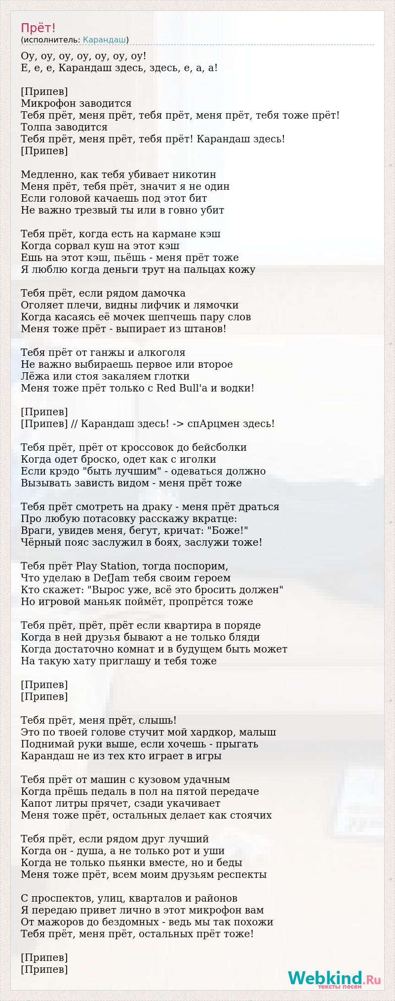Оу, оу, оу, оу, оу, оу, оу! Е, е, е, Карандаш здесь, здесь, е, а, а! [Припев] Микрофон заводится Тебя прёт, меня прёт, тебя прёт, меня прёт, тебя тоже прёт! Толпа заводится Тебя прёт, меня прёт, тебя прёт! Карандаш здесь! [Припев] Медленно, как тебя убивает никотин Меня прёт, тебя прёт, значит я не один Если головой качаешь под этот бит Не важно трезвый ты или в говно убит Тебя прёт, когда есть на кармане кэш Когда сорвал куш на этот кэш Ешь на этот кэш, пьёшь - меня прёт тоже Я люблю когда деньги трут на пальцах кожу Тебя прёт, если рядом дамочка Оголяет плечи, видны лифчик и лямочки Когда касаясь её мочек шепчешь пару слов Меня тоже прёт - выпирает из штанов! Тебя прёт от ганжы и алкоголя Не важно выбираешь первое или второе Лёжа или стоя закаляем глотки Меня тоже прёт только с Red Bull'а и водки! [Припев] [Припев] // Карандаш здесь! -> спАрцмен здесь! Тебя прёт, прёт от кроссовок до бейсболки Когда одет броско, одет как с иголки Если крэдо "быть лучшим" - одеваться должно Вызывать зависть видом - меня прёт тоже Тебя прёт смотреть на драку - меня прёт драться Про любую потасовку расскажу вкратце: Враги, увидев меня, бегут, кричат: "Боже!" Чёрный пояс заслужил в боях, заслужи тоже! Тебя прёт Play Station, тогда поспорим, Что уделаю в DefJam тебя своим героем Кто скажет: "Вырос уже, всё это бросить должен" Но игровой маньяк поймёт, пропрётся тоже Тебя прёт, прёт, прёт если квартира в поряде Когда в ней друзья бывают а не только бляди Когда достаточно комнат и в будущем быть может На такую хату приглашу и тебя тоже [Припев] [Припев] Тебя прёт, меня прёт, слышь! Это по твоей голове стучит мой хардкор, малыш Поднимай руки выше, если хочешь - прыгать Карандаш не из тех кто играет в игры Тебя прёт от машин с кузовом удачным Когда прёшь педаль в пол на пятой передаче Капот литры прячет, сзади укачивает Меня тоже прёт, остальных делает как стоячих Тебя прёт, если рядом друг лучший Когда он - душа, а не только рот и уши Когда не только пьянки вместе, но и беды Меня тоже прёт, всем моим друзьям респекты С проспектов, улиц, кварталов и районов Я передаю привет лично в этот микрофон вам От мажоров до бездомных - ведь мы так похожи Тебя прёт, меня прёт, остальных прёт тоже! [Припев] [Припев]