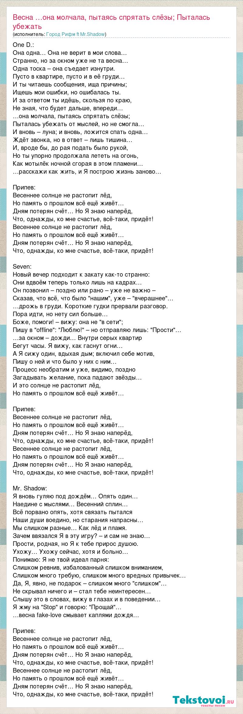 One D.: Она одна… Она не верит в мои слова… Странно, но за окном уже не та весна… Одна тоска – она съедает изнутри. Пусто в квартире, пусто и в её груди… И ты читаешь сообщения, ища причины; Ищешь мои ошибки, но ошибалась ты. И за ответом ты идёшь, скользя по краю, Не зная, что будет дальше, впереди… …она молчала, пытаясь спрятать слёзы; Пыталась убежать от мыслей, но не смогла… И вновь – луна; и вновь, ложится спать одна… Ждёт звонка, но в ответ – лишь тишина… И, вроде бы, до рая подать было рукой, Но ты упорно продолжала лететь на огонь, Как мотылёк ночной сгорая в этом пламени… …расскажи как жить, и Я построю жизнь заново… Припев: Весеннее солнце не растопит лёд, Но память о прошлом всё ещё живёт… Дням потерян счёт… Но Я знаю наперёд, Что, однажды, ко мне счастье, всё-таки, придёт! Весеннее солнце не растопит лёд, Но память о прошлом всё ещё живёт… Дням потерян счёт… Но Я знаю наперёд, Что, однажды, ко мне счастье, всё-таки, придёт! Seven: Новый вечер подходит к закату как-то странно: Они вдвоём теперь только лишь на кадрах… Он позвонил – поздно или рано – уже не важно – Сказав, что всё, что было "нашим", уже – "вчерашнее"… …дрожь в груди. Короткие гудки прервали разговор. Пора идти, но нету сил больше… Боже, помоги! – вижу: она не "в сети"; Пишу в "offline": "Люблю!" – но отправляю лишь: "Прости"… …за окном – дожди… Внутри серых квартир Бегут часы. Я вижу, как гаснут огни… А Я сижу один, вдыхая дым; включил себе мотив, Пишу о ней и что было у них с ним… Процесс необратим и уже, видимо, поздно Загадывать желание, пока падают звёзды… И это солнце не растопит лёд, Но память о прошлом всё ещё живёт… Припев: Весеннее солнце не растопит лёд, Но память о прошлом всё ещё живёт… Дням потерян счёт… Но Я знаю наперёд, Что, однажды, ко мне счастье, всё-таки, придёт! Весеннее солнце не растопит лёд, Но память о прошлом всё ещё живёт… Дням потерян счёт… Но Я знаю наперёд, Что, однажды, ко мне счастье, всё-таки, придёт! Mr. Shadow: Я вновь гуляю под дождём… Опять один… Наедине с мыслями… Весенний сплин… Всё порвано опять, хотя связать пытался Наши души воедино, но старания напрасны… Мы слишком разные… Как лёд и пламя. Зачем ввязался Я в эту игру? – и сам не знаю… Прости, родная, но Я к тебе прирос душою. Ухожу… Ухожу сейчас, хотя и больно… Понимаю: Я не твой идеал парня: Слишком ревнив, избалованный слишком вниманием, Слишком много требую, слишком много вредных привычек… Да, Я, явно, не подарок – слишком много "слишком"… Не скрывал ничего и – стал тебе неинтересен… Слышу это в словах, вижу в глазах и в поведении… Я жму на "Stop" и говорю: "Прощай"… …весна fake-love смывает каплями дождя… Припев: Весеннее солнце не растопит лёд, Но память о прошлом всё ещё живёт… Дням потерян счёт… Но Я знаю наперёд, Что, однажды, ко мне счастье, всё-таки, придёт! Весеннее солнце не растопит лёд, Но память о прошлом всё ещё живёт… Дням потерян счёт… Но Я знаю наперёд, Что, однажды, ко мне счастье, всё-таки, придёт!