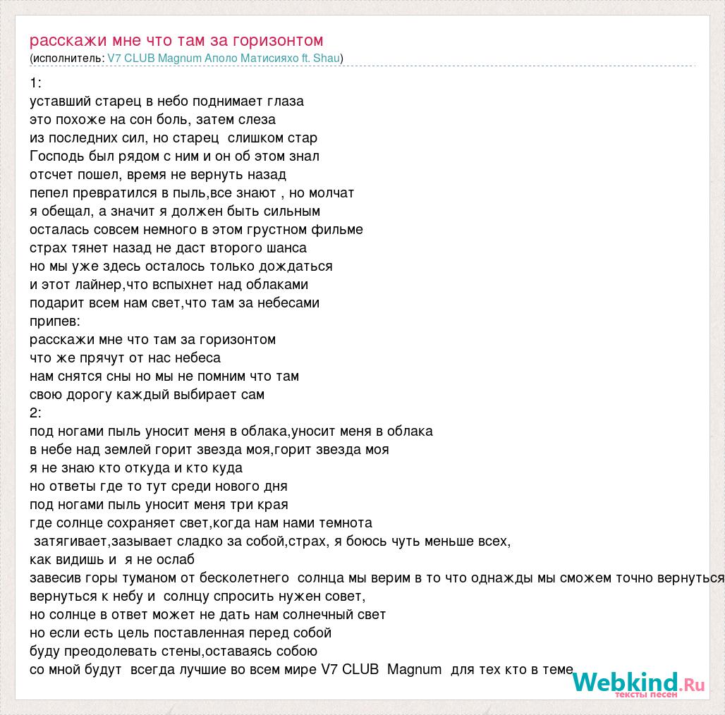 1: уставший старец в небо поднимает глаза это похоже на сон боль, затем слеза из последних сил, но старец слишком стар Господь был рядом с ним и он об этом знал отсчет пошел, время не вернуть назад пепел превратился в пыль,все знают , но молчат я обещал, а значит я должен быть сильным осталась совсем немного в этом грустном фильме страх тянет назад не даст второго шанса но мы уже здесь осталось только дождаться и этот лайнер,что вспыхнет над облаками подарит всем нам свет,что там за небесами припев: расскажи мне что там за горизонтом что же прячут от нас небеса нам снятся сны но мы не помним что там свою дорогу каждый выбирает сам 2: под ногами пыль уносит меня в облака,уносит меня в облака в небе над землей горит звезда моя,горит звезда моя я не знаю кто откуда и кто куда но ответы где то тут среди нового дня под ногами пыль уносит меня три края где солнце сохраняет свет,когда нам нами темнота затягивает,зазывает сладко за собой,страх, я боюсь чуть меньше всех, как видишь и я не ослаб завесив горы туманом от бесколетнего солнца мы верим в то что однажды мы сможем точно вернуться вернуться к небу и солнцу спросить нужен совет, но солнце в ответ может не дать нам солнечный свет но если есть цель поставленная перед собой буду преодолевать стены,оставаясь собою со мной будут всегда лучшие во всем мире V7 CLUB Magnum для тех кто в теме