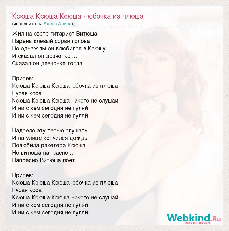 Жил на свете гитарист Витюша Парень клевый сорви голова Но однажды он влюбился в Ксюшу И сказал он девчонке ... Сказал он девчонке тогда Припев: Ксюша Ксюша Ксюша юбочка из плюша Русая коса Ксюша Ксюша Ксюша никого не слушай И ни с кем сегодня не гуляй И ни с кем сегодня не гуляй Надоело эту песню слушать И на улице кончился дождь Полюбила рэкетера Ксюша Но витюша напрасно ... Напрасно Витюша поет Припев: Ксюша Ксюша Ксюша юбочка из плюша Русая коса Ксюша Ксюша Ксюша никого не слушай И ни с кем сегодня не гуляй И ни с кем сегoдня не гуляй
