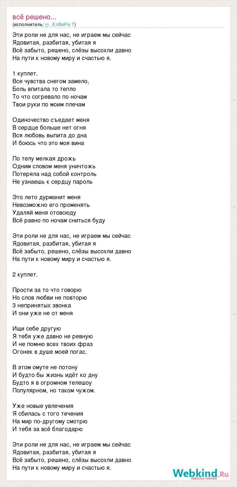 Эти роли не для нас, не играем мы сейчас Ядовитая, разбитая, убитая я Всё забыто, решено, слёзы высохли давно На пути к новому миру и счастью я. 1 куплет. Все чувства снегом замело, Боль впитала то тепло То что согревало по ночам Твои руки по моим плечам Одиночество съедает меня В сердце больше нет огня Вся любовь выпита до дна И боюсь что это моя вина По телу мелкая дрожь Одним словом меня уничтожь Потеряла над собой контроль Не узнаешь к сердцу пароль Это лето дурманит меня Невозможно его променять Удаляй меня отовсюду Всё равно по ночам сниться буду Эти роли не для нас, не играем мы сейчас Ядовитая, разбитая, убитая я Всё забыто, решено, слёзы высохли давно На пути к новому миру и счастью я. 2 куплет. Прости за то что говорю Но слов любви не повторю 3 непринятых звонка И они уже не от меня Ищи себе другую Я тебя уже давно не ревную И не помню всех твоих фраз Огонек в душе моей погас. В этом омуте не потону И будто бы жизнь идёт ко дну Будто я в огромном телешоу Популярном, но таком чужом. Уже новые увлечения Я сбилась с того течения На мир по-другому смотрю И тебя за всё благодарю Эти роли не для нас, не играем мы сейчас Ядовитая, разбитая, убитая я Всё забыто, решено, слёзы высохли давно На пути к новому миру и счастью я.