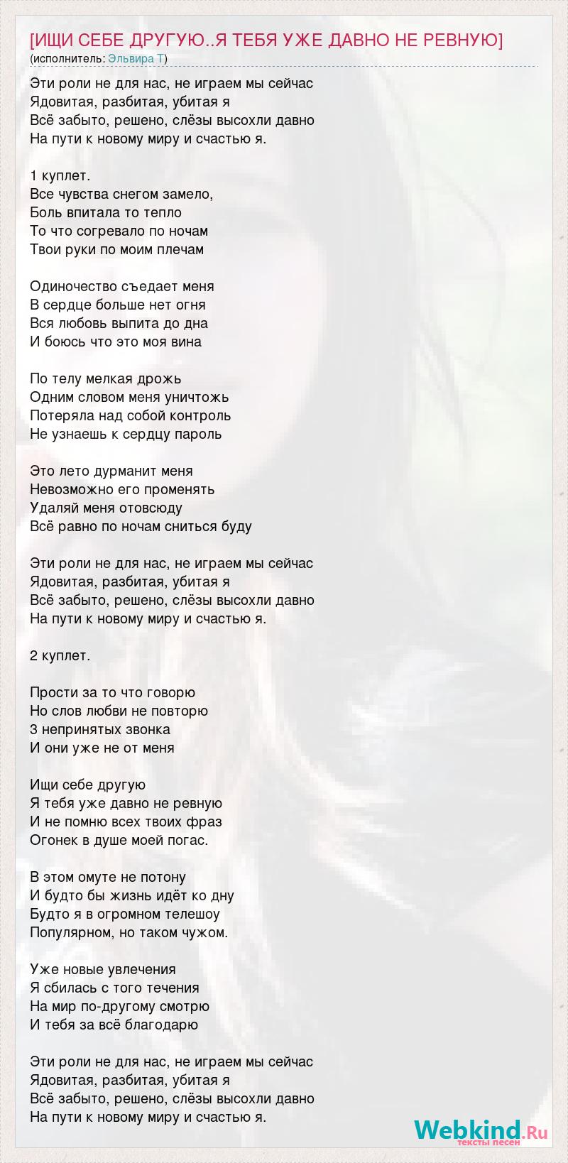 Эти роли не для нас, не играем мы сейчас Ядовитая, разбитая, убитая я Всё забыто, решено, слёзы высохли давно На пути к новому миру и счастью я. 1 куплет. Все чувства снегом замело, Боль впитала то тепло То что согревало по ночам Твои руки по моим плечам Одиночество съедает меня В сердце больше нет огня Вся любовь выпита до дна И боюсь что это моя вина По телу мелкая дрожь Одним словом меня уничтожь Потеряла над собой контроль Не узнаешь к сердцу пароль Это лето дурманит меня Невозможно его променять Удаляй меня отовсюду Всё равно по ночам сниться буду Эти роли не для нас, не играем мы сейчас Ядовитая, разбитая, убитая я Всё забыто, решено, слёзы высохли давно На пути к новому миру и счастью я. 2 куплет. Прости за то что говорю Но слов любви не повторю 3 непринятых звонка И они уже не от меня Ищи себе другую Я тебя уже давно не ревную И не помню всех твоих фраз Огонек в душе моей погас. В этом омуте не потону И будто бы жизнь идёт ко дну Будто я в огромном телешоу Популярном, но таком чужом. Уже новые увлечения Я сбилась с того течения На мир по-другому смотрю И тебя за всё благодарю Эти роли не для нас, не играем мы сейчас Ядовитая, разбитая, убитая я Всё забыто, решено, слёзы высохли давно На пути к новому миру и счастью я.
