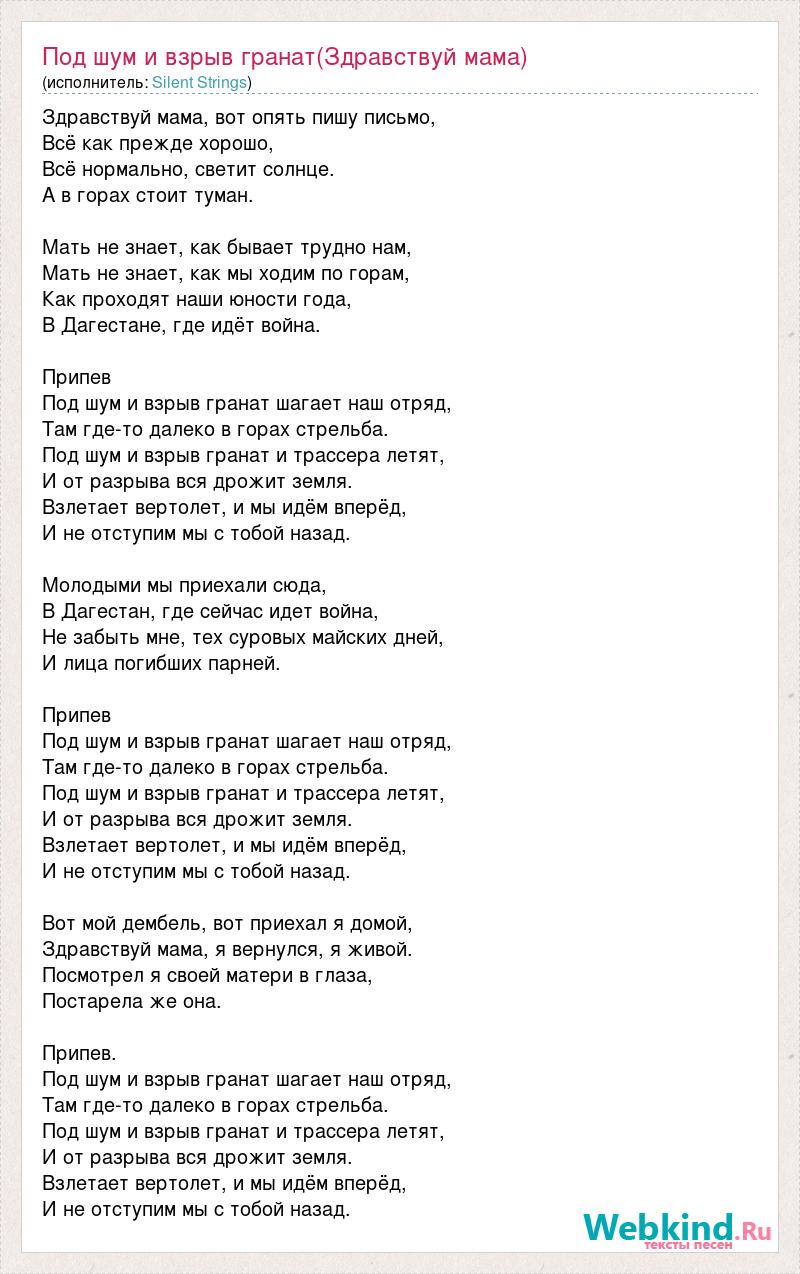 Здравствуй мама, вот опять пишу письмо, Всё как прежде хорошо, Всё нормально, светит солнце. А в горах стоит туман. Мать не знает, как бывает трудно нам, Мать не знает, как мы ходим по горам, Как проходят наши юности года, В Дагестане, где идёт война. Припев Под шум и взрыв гранат шагает наш отряд, Там где-то далеко в горах стрельба. Под шум и взрыв гранат и трассера летят, И от разрыва вся дрожит земля. Взлетает вертолет, и мы идём вперёд, И не отступим мы с тобой назад. Молодыми мы приехали сюда, В Дагестан, где сейчас идет война, Не забыть мне, тех суровых майских дней, И лица погибших парней. Припев Под шум и взрыв гранат шагает наш отряд, Там где-то далеко в горах стрельба. Под шум и взрыв гранат и трассера летят, И от разрыва вся дрожит земля. Взлетает вертолет, и мы идём вперёд, И не отступим мы с тобой назад. Вот мой дембель, вот приехал я домой, Здравствуй мама, я вернулся, я живой. Посмотрел я своей матери в глаза, Постарела же она. Припев. Под шум и взрыв гранат шагает наш отряд, Там где-то далеко в горах стрельба. Под шум и взрыв гранат и трассера летят, И от разрыва вся дрожит земля. Взлетает вертолет, и мы идём вперёд, И не отступим мы с тобой назад.