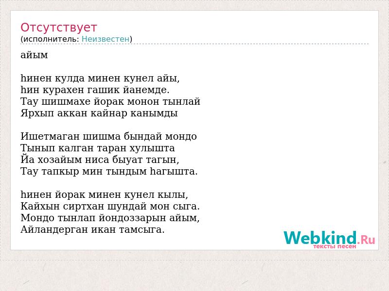 айым hинен кулда минен кунел айы, hин курахен гашик йанемде. Тау шишмахе йорак монон тынлай Ярхып аккан кайнар канымды Ишетмаган шишма бындай мондо Тынып калган таран хулышта Йа хозайым ниса быуат тагын, Тау тапкыр мин тындым hагышта. hинен йорак минен кунел кылы, Кайхын сиртхан шундай мон сыга. Мондо тынлап йондоззарын айым, Айландерган икан тамсыга.