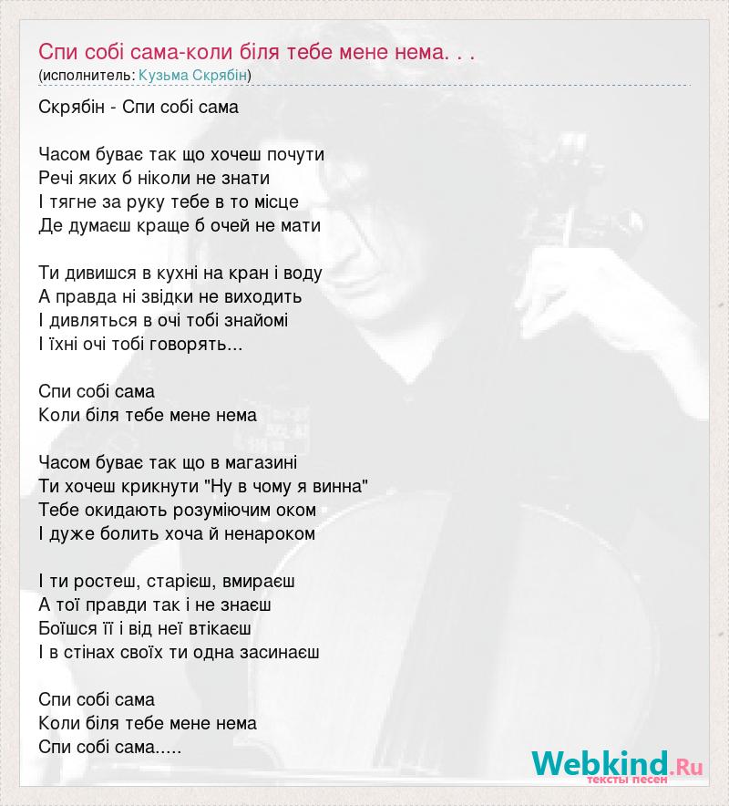 Скрябін - Спи собі сама Часом буває так що хочеш почути Речі яких б ніколи не знати I тягне за руку тебе в то мiсце Де думаєш краще б очей не мати Ти дивишся в кухнi на кран i воду А правда нi звiдки не виходить I дивляться в очi тобi знайомi I їхнi очi тобi говорять... Спи собі сама Коли біля тебе мене нема Часом буває так що в магазинi Ти хочеш крикнути "Ну в чому я винна" Тебе окидають розумiючим оком I дуже болить хоча й ненароком I ти ростеш, старiєш, вмираєш А тої правди так i не знаєш Боїшся її i вiд неї втiкаєш I в стiнах своїх ти одна засинаєш Спи собі сама Коли біля тебе мене нема Спи собi сама.....