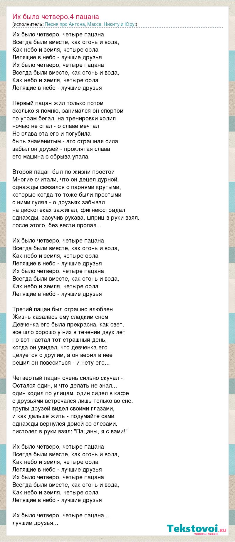 Их было четверо, четыре пацана Всегда были вместе, как огонь и вода, Как небо и земля, четыре орла Летящие в небо - лучшие друзья Их было четверо, четыре пацана Всегда были вместе, как огонь и вода, Как небо и земля, четыре орла Летящие в небо - лучшие друзья Первый пацан жил только потом сколько я помню, занимался он спортом по утрам бегал, на тренировки ходил ночью не спал - о славе мечтал Но слава эта его и погубила быть знаменитым - это страшная сила забыл он друзей - проклятая слава его машина с обрыва упала. Второй пацан был по жизни простой Многие считали, что он децел дурной, однажды связался с парнями крутыми, которые когда-то тоже были простыми с ними гулял - о друзьях забывал на дискотеках зажигал, фигнеюстрадал однажды, засучив рукава, шприц в руки взял. после этого, без вести пропал... Их было четверо, четыре пацана Всегда были вместе, как огонь и вода, Как небо и земля, четыре орла Летящие в небо - лучшие друзья Их было четверо, четыре пацана Всегда были вместе, как огонь и вода, Как небо и земля, четыре орла Летящие в небо - лучшие друзья Третий пацан был страшно влюблен Жизнь казалась ему сладким сном Девченка его была прекрасна, как свет. все шло хорошо у них в течении двух лет но вот настал тот страшный день, когда он увидел, что девченка его целуется с другим, а он верил в нее решил он повеситься - и нету его... Четвертый пацан очень сильно скучал - Остался один, и что делать не знал... один ходил по улицам, один сидел в кафе с друзьями встречался лишь только во сне. трупы друзей видел своими глазами, и как дальше жить - подумайте сами однажды вернулся домой со слезами. пистолет в руки взял: "Пацаны, я с вами!" Их было четверо, четыре пацана Всегда были вместе, как огонь и вода, Как небо и земля, четыре орла Летящие в небо - лучшие друзья Их было четверо, четыре пацана Всегда были вместе, как огонь и вода, Как небо и земля, четыре орла Летящие в небо - лучшие друзья Их было четверо, четыре пацана... лучшие друзья...