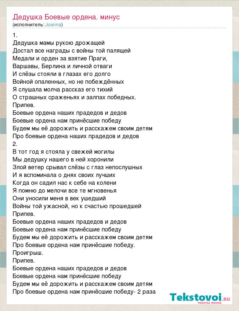 1. Дедушка мамы рукою дрожащей Достал все награды с войны той палящей Медали и орден за взятие Праги, Варшавы, Берлина и личной отваги И слёзы стояли в глазах его долго Войной опаленных, но не побеждённых Я слушала молча рассказ его тихий О страшных сраженьях и залпах победных. Припев. Боевые ордена наших прадедов и дедов Боевые ордена нам принёсшие победу Будем мы её дорожить и расскажем своим детям Про боевые ордена наших прадедов и дедов 2. В тот год я стояла у свежей могилы Мы дедушку нашего в ней хоронили Злой ветер срывал слёзы с глаз непослушных И я вспоминала о днях своих лучших Когда он садил нас к себе на колени Я помню до мелочи все те мгновенья Они уносили меня в век ушедший Войны той ужасной, но к счастью прошедшей Припев. Боевые ордена наших прадедов и дедов Боевые ордена нам принёсшие победу Будем мы её дорожить и расскажем своим детям Про боевые ордена нам принёсшие победу. Проигрыш. Припев. Боевые ордена наших прадедов и дедов Боевые ордена нам принёсшие победу Будем мы её дорожить и расскажем своим детям Про боевые ордена нам принёсшие победу- 2 раза