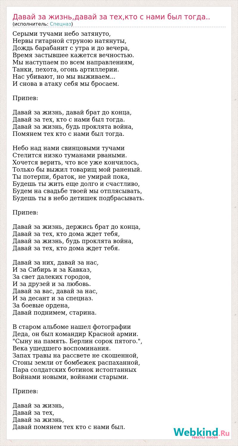 Серыми тучами небо затянуто, Нервы гитарной струною натянуты, Дождь барабанит с утра и до вечера, Время застывшее кажется вечностью. Мы наступаем по всем направлениям, Танки, пехота, огонь артиллерии. Нас убивают, но мы выживаем... И снова в атаку себя мы бросаем. Припев: Давай за жизнь, давай брат до конца, Давай за тех, кто с нами был тогда. Давай за жизнь, будь проклята война, Помянем тех кто с нами был тогда. Небо над нами свинцовыми тучами Стелится низко туманами рваными. Хочется верить, что все уже кончилось, Только бы выжил товарищ мой раненый. Ты потерпи, браток, не умирай пока, Будешь ты жить еще долго и счастливо, Будем на свадьбе твоей мы отплясывать, Будешь ты в небо детишек подбрасывать. Припев: Давай за жизнь, держись брат до конца, Давай за тех, кто дома ждет тебя, Давай за жизнь, будь проклята война, Давай за тех, кто дома ждет тебя. Давай за них, давай за нас, И за Сибирь и за Кавказ, За свет далеких городов, И за друзей и за любовь. Давай за вас, давай за нас, И за десант и за спецназ. За боевые ордена, Давай поднимем, старина. В старом альбоме нашел фотографии Деда, он был командир Красной армии. "Сыну на память. Берлин сорок пятого.", Века ушедшего воспоминания. Запах травы на рассвете не скошенной, Стоны земли от бомбежек распаханной, Пара солдатских ботинок истоптанных Войнами новыми, войнами старыми. Припев: Давай за жизнь, Давай за тех, Давай за жизнь, Давай помянем тех кто с нами был.